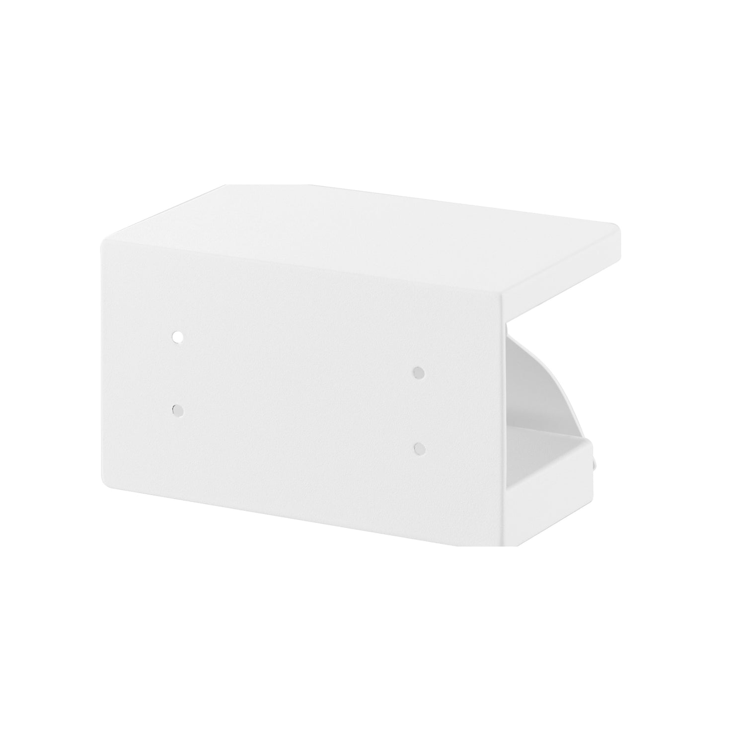 Praktisk toalettpapirholder i metall med matt hvit overflate. Monteres enkelt på veggen med medfølgende skruer eller pinner, og den åpne siden gjør det raskt å bytte rull. Den flate toppen gir plass til små baderomsartikler eller mobiltelefon.