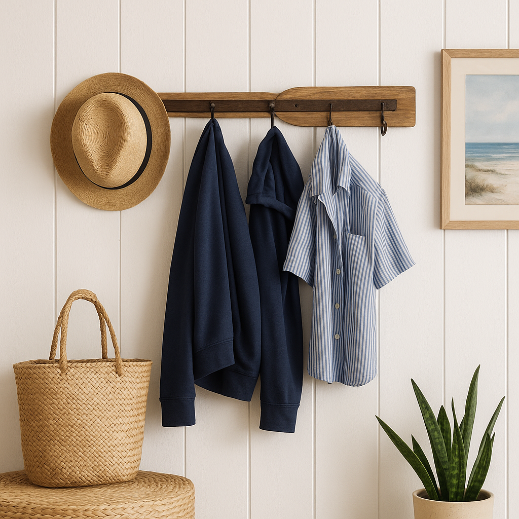 Kystinspirert knaggrekke formet som en åre, med sommerplagg og hatt på hvit panelvegg.