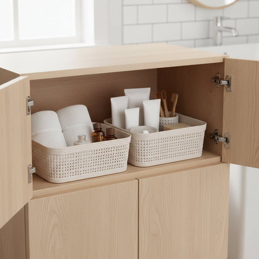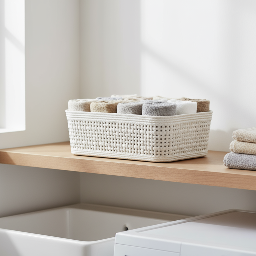 Praktiske og dekorative oppbevaringskurver i sandfarget plast med vevd design. Kurvene er lette, slitesterke og enkle å rengjøre, samtidig som de gir et moderne og ryddig uttrykk. Perfekte til småoppbevaring på badet, kjøkkenet, kontoret eller i garderoben.