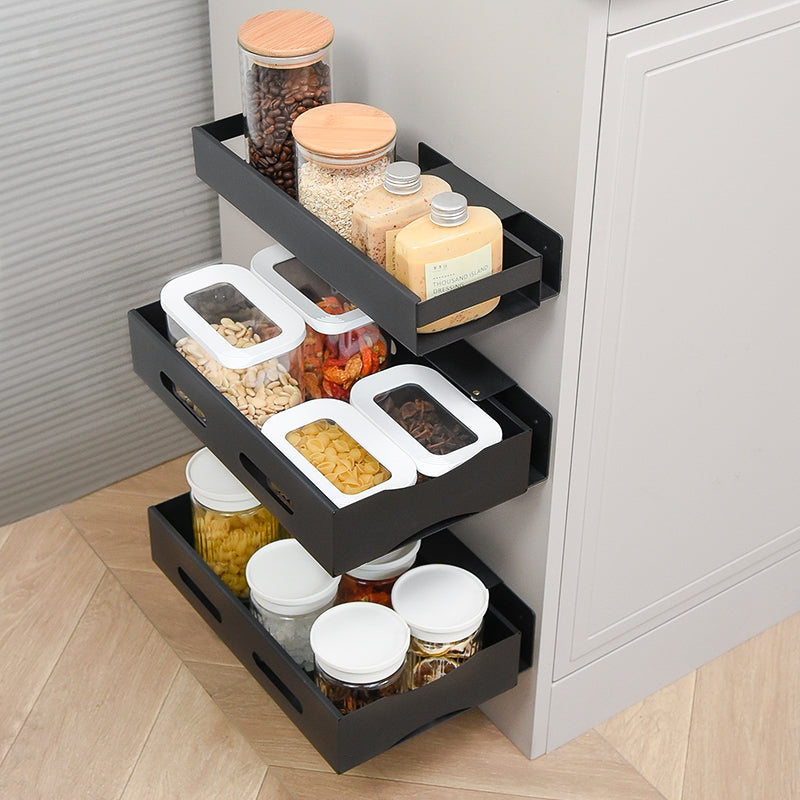 Veggmontert uttrekkbar hylle i matt sort metall. Perfekt til oppbevaring av matvarer, hobbyskaper, rengjøringmidler, eller skjønnhetsprodukter.