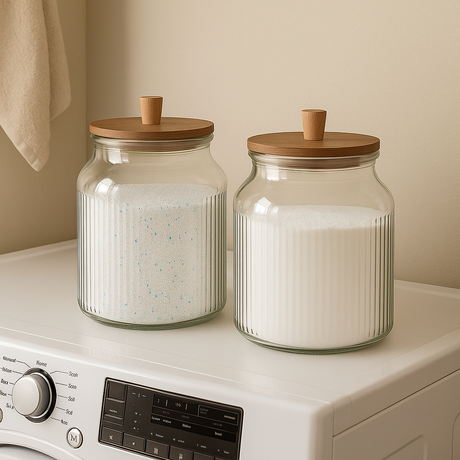 Hold orden på vaskepulver, tøymykner og rengjøringsmidler med våre praktiske glasskrukker og oppbevaringsbokser. Vi har sett med glasskrukker i ulike størrelser – perfekte for vaskemiddel, natron, såpeflak eller andre produkter du bruker ofte. Kombiner med våre selvklebende etiketter spesielt laget for vaskerommet, slik at du enkelt vet hva som er hva, og samtidig skaper et ryddig og helhetlig uttrykk.