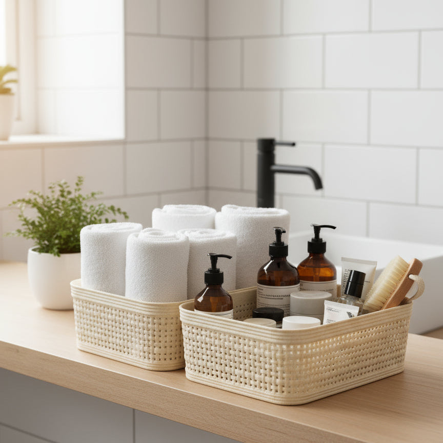 Praktiske og dekorative oppbevaringskurver i sandfarget plast med vevd design. Kurvene er lette, slitesterke og enkle å rengjøre, samtidig som de gir et moderne og ryddig uttrykk. Perfekte til småoppbevaring på badet, kjøkkenet, kontoret eller i garderoben.