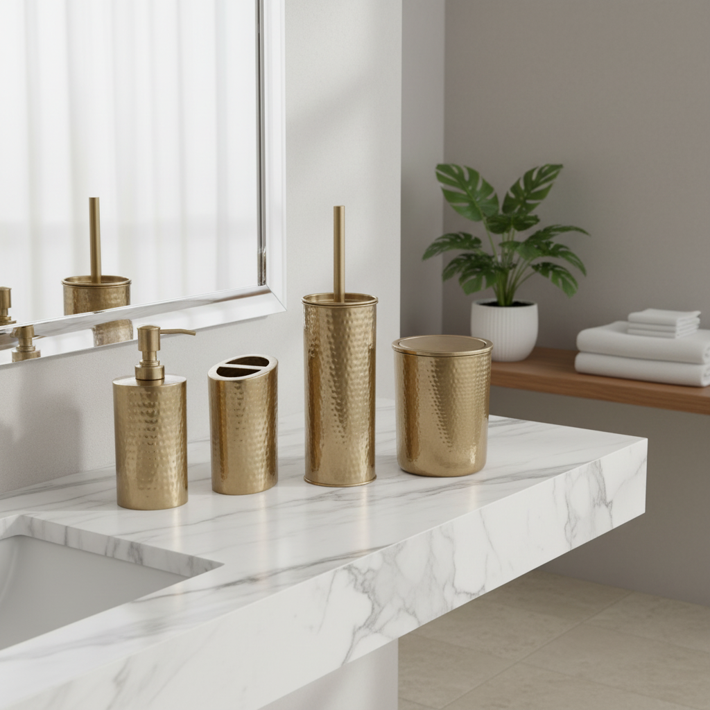 Gi badet et helhetlig og gjennomført uttrykk med dette komplette baderomssettet i metall. Settet har en flott hamret overflate som gir liv og karakter uten å ta for mye oppmerksomhet. Den varme gulltonen tilfører et eksklusivt preg som passer både på moderne og klassiske bad.