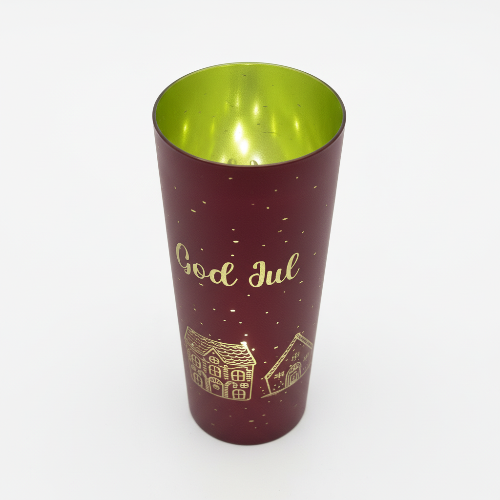 Gi hjemmet et varmt julelys med LED-lykt Pepperkakeby i rød metallfinish. Den lille sylindriske lykten har utskårne detaljer av en koselig pepperkakeby og teksten God Jul, som lyser stemningsfullt når LED-lyset tennes.