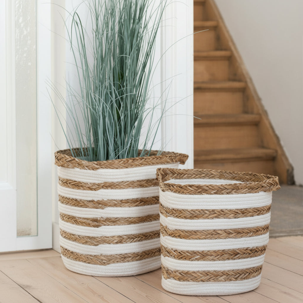 Dette settet med 2 oppbevaringskurver kombinerer funksjonalitet med nordisk design. Håndlaget av naturlig gress og myk bomull med et tidløst stripet mønster i hvitt og naturfarger.