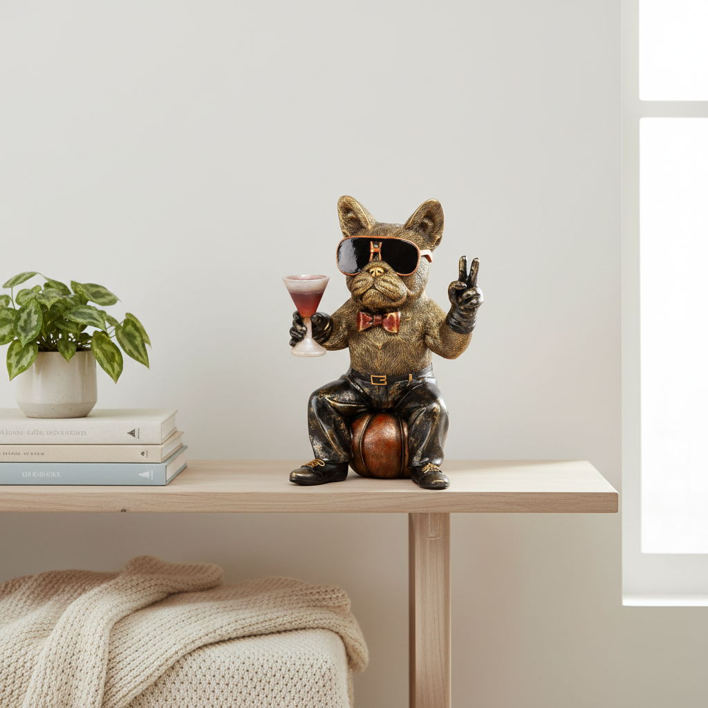 Hund party med glass er en detaljrik og uttrykksfull figur som skaper god stemning i rommet.