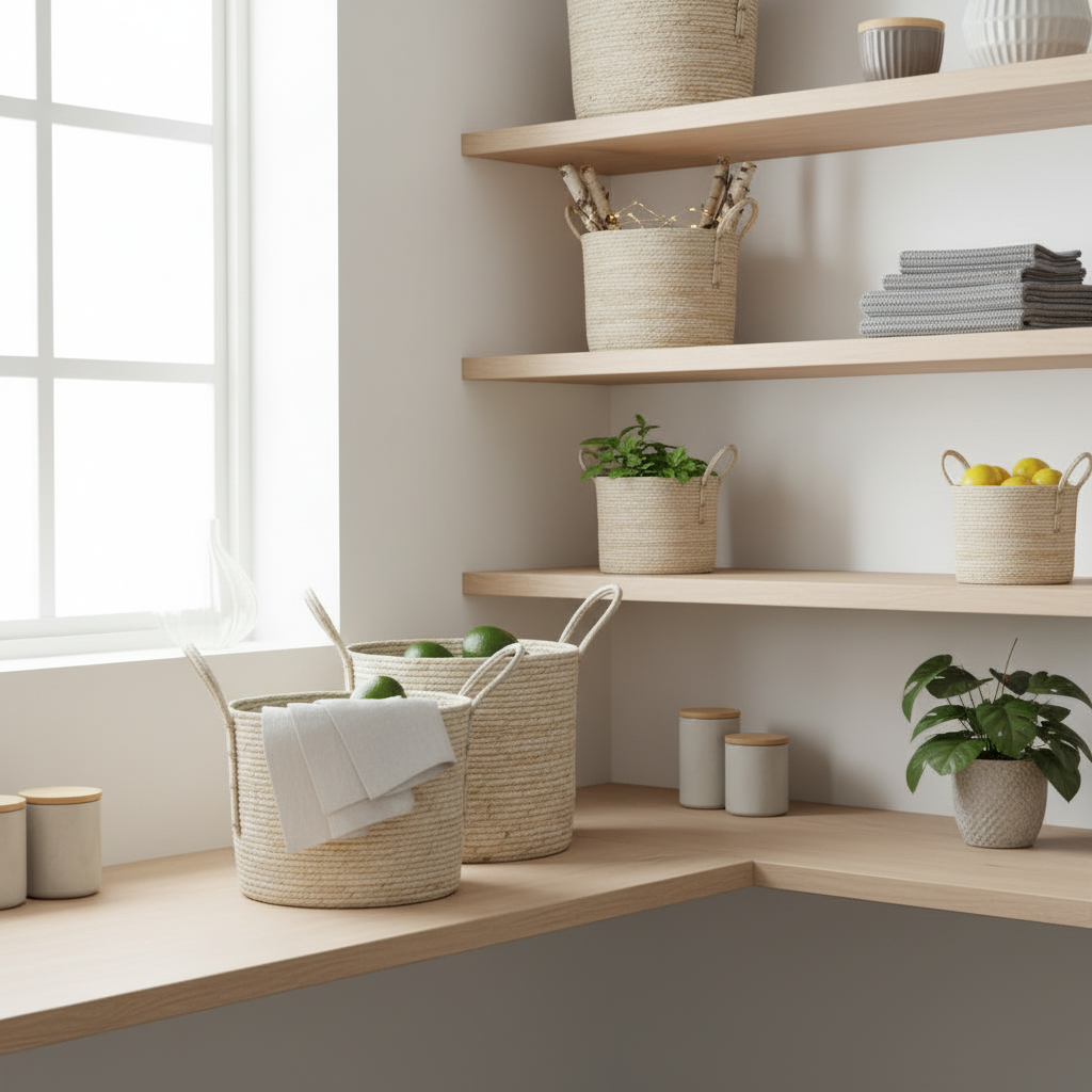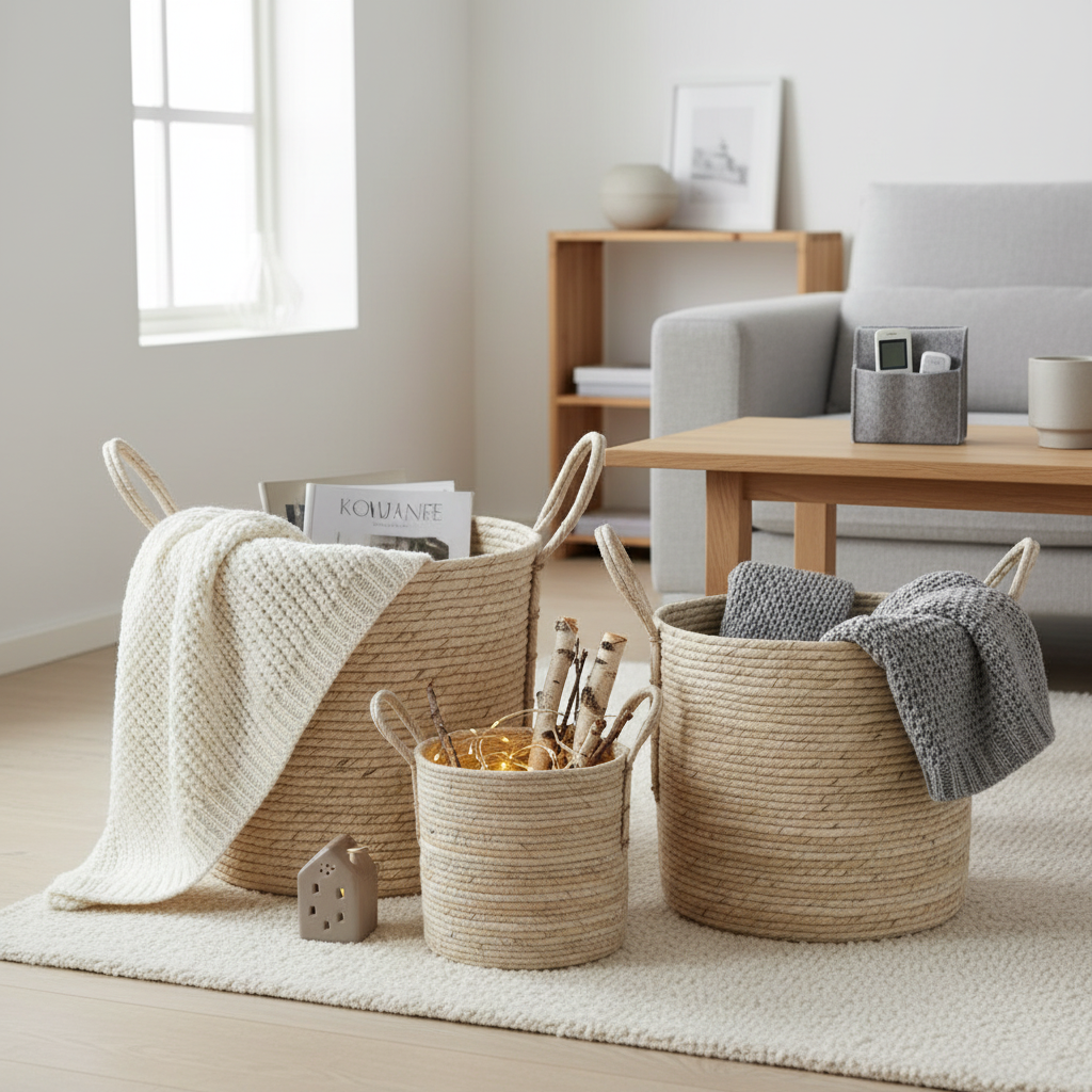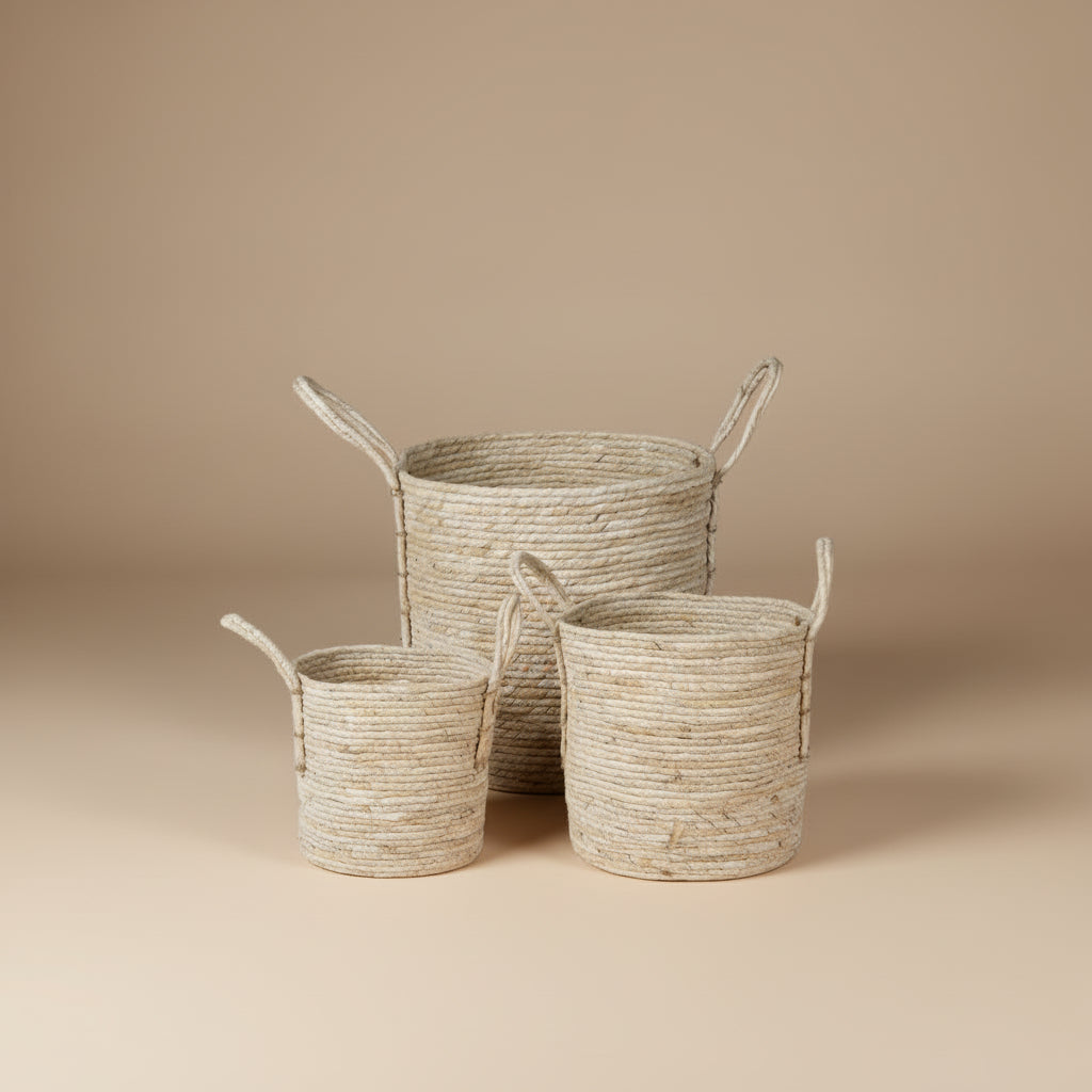 Disse håndflettede kurvene i naturlig maisblad bringer varm, organisk tekstur inn i hjemmet ditt. Settet består av tre runde kurver i graderte størrelser (23cm, 28cm og 33cm) som kan brukes sammen eller hver for seg.