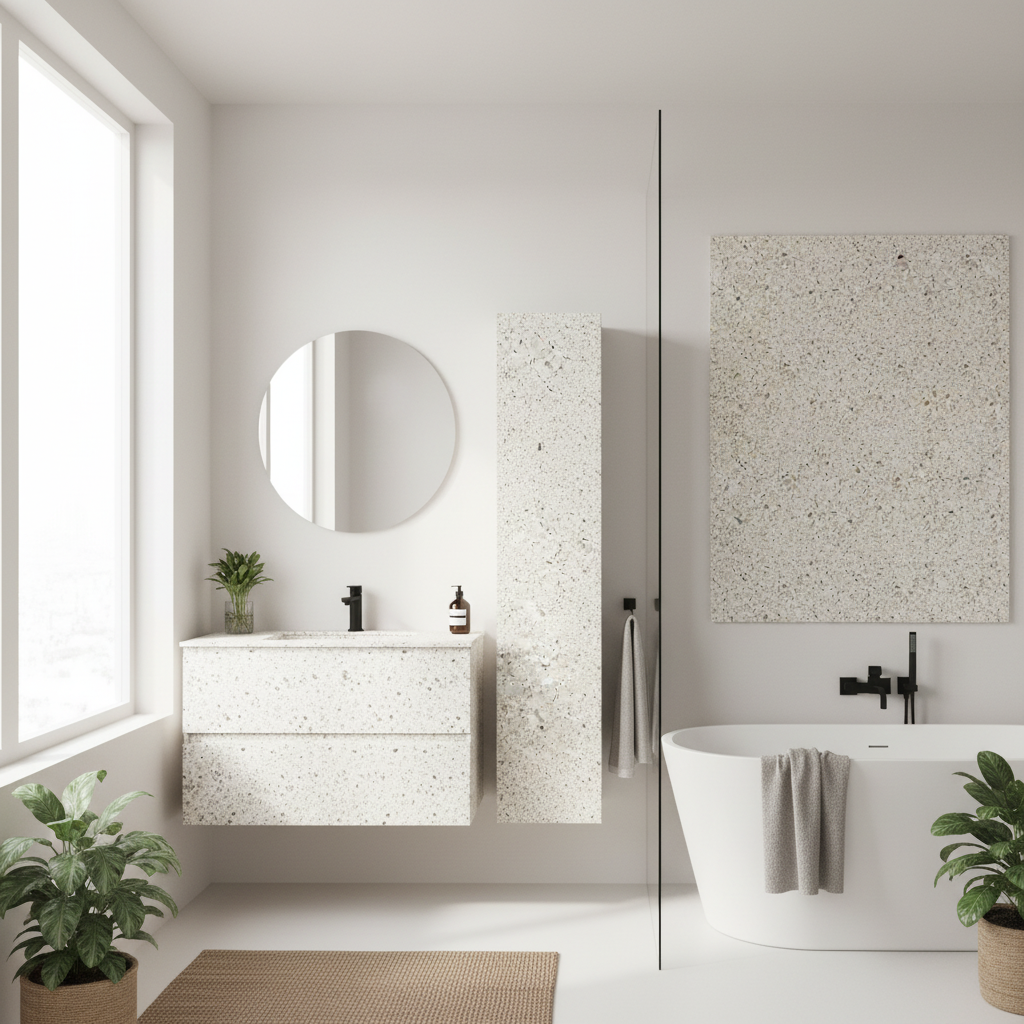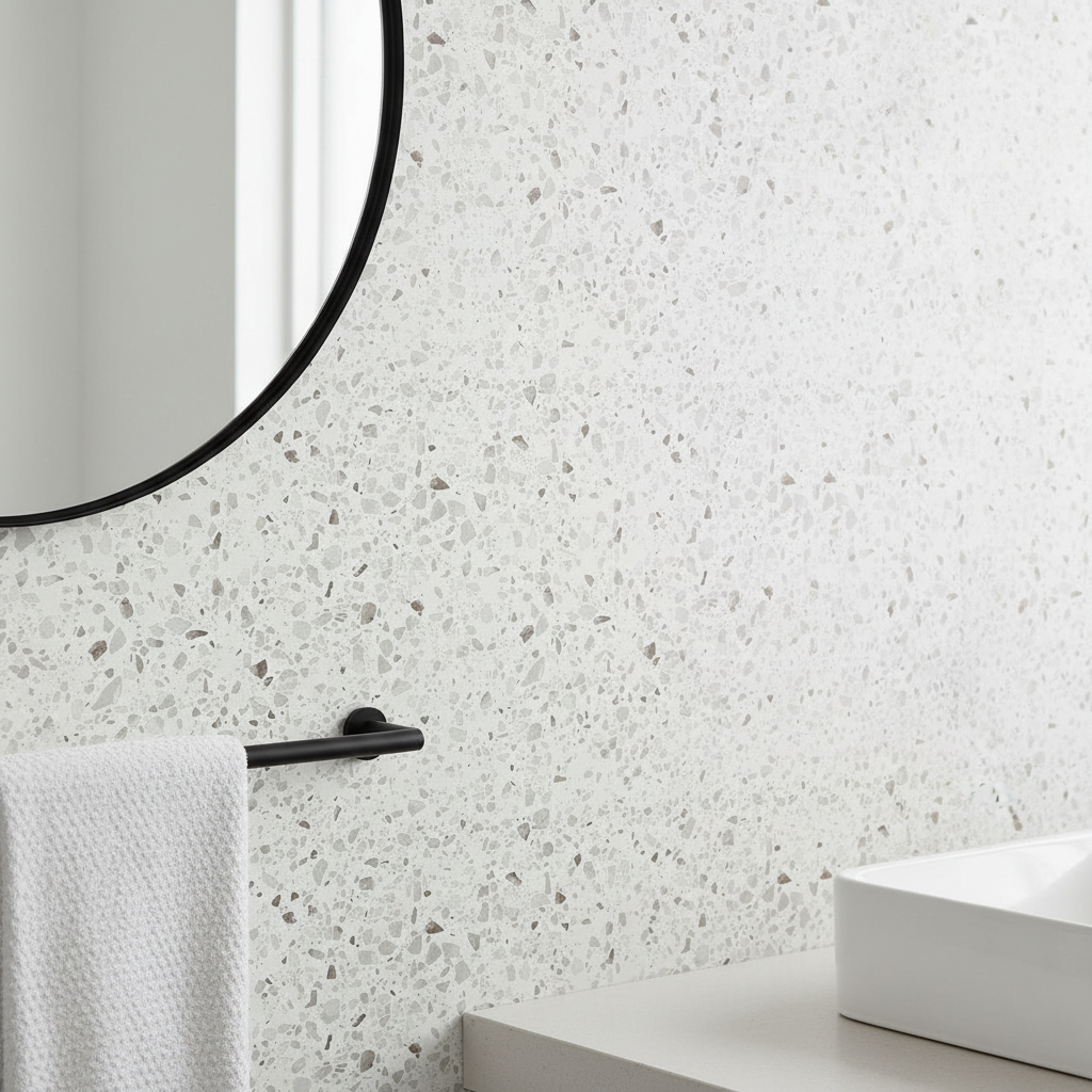 Bruk den på benkeplater og kjøkkenflater for å løfte hele rommet. Den passer også perfekt på baderomsmøbler der du ønsker en lys steinlook som ser fresh ut. På kommoder, hyller og bord