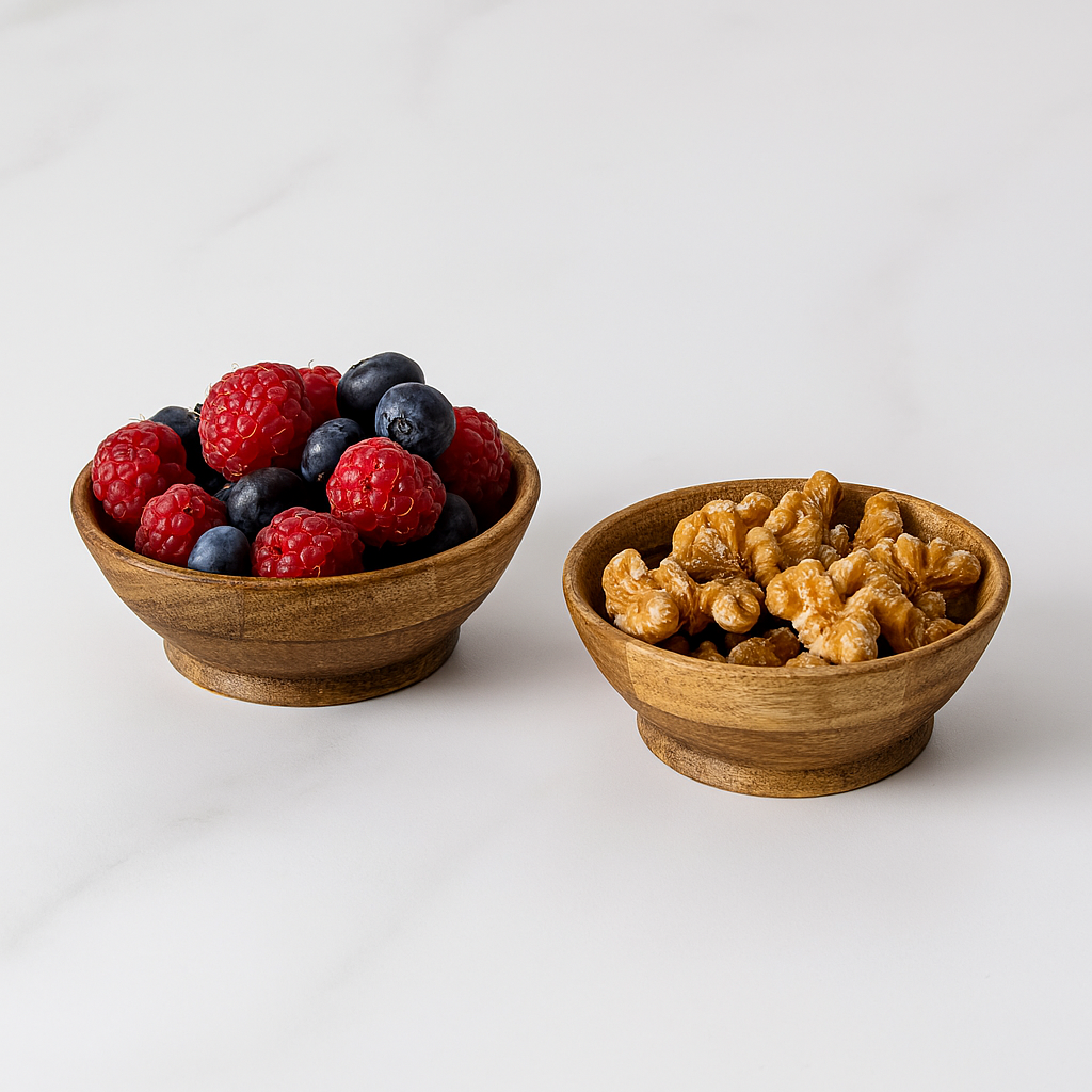 Rustikke serveringsskåler i tre fylt med ferske bringebær, blåbær og valnøtter – perfekt til kjøkken, servering og naturlig borddekorasjon