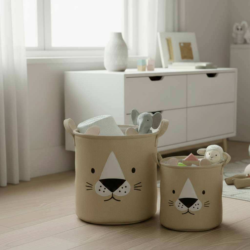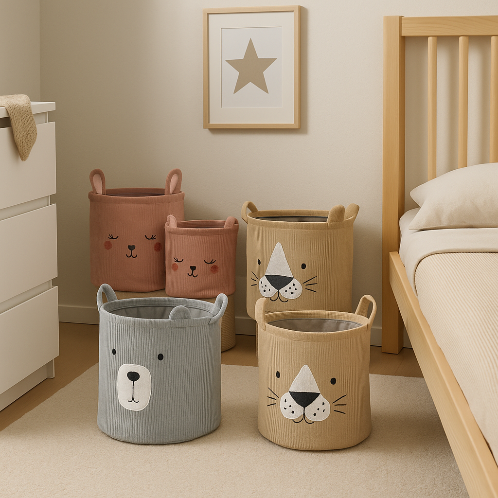 Sett med to myke oppbevaringskurver i cordstoff med dyremotiv, perfekt til barnerom eller stue.
