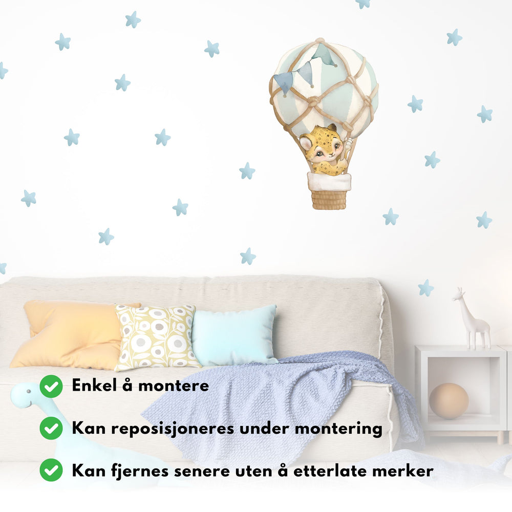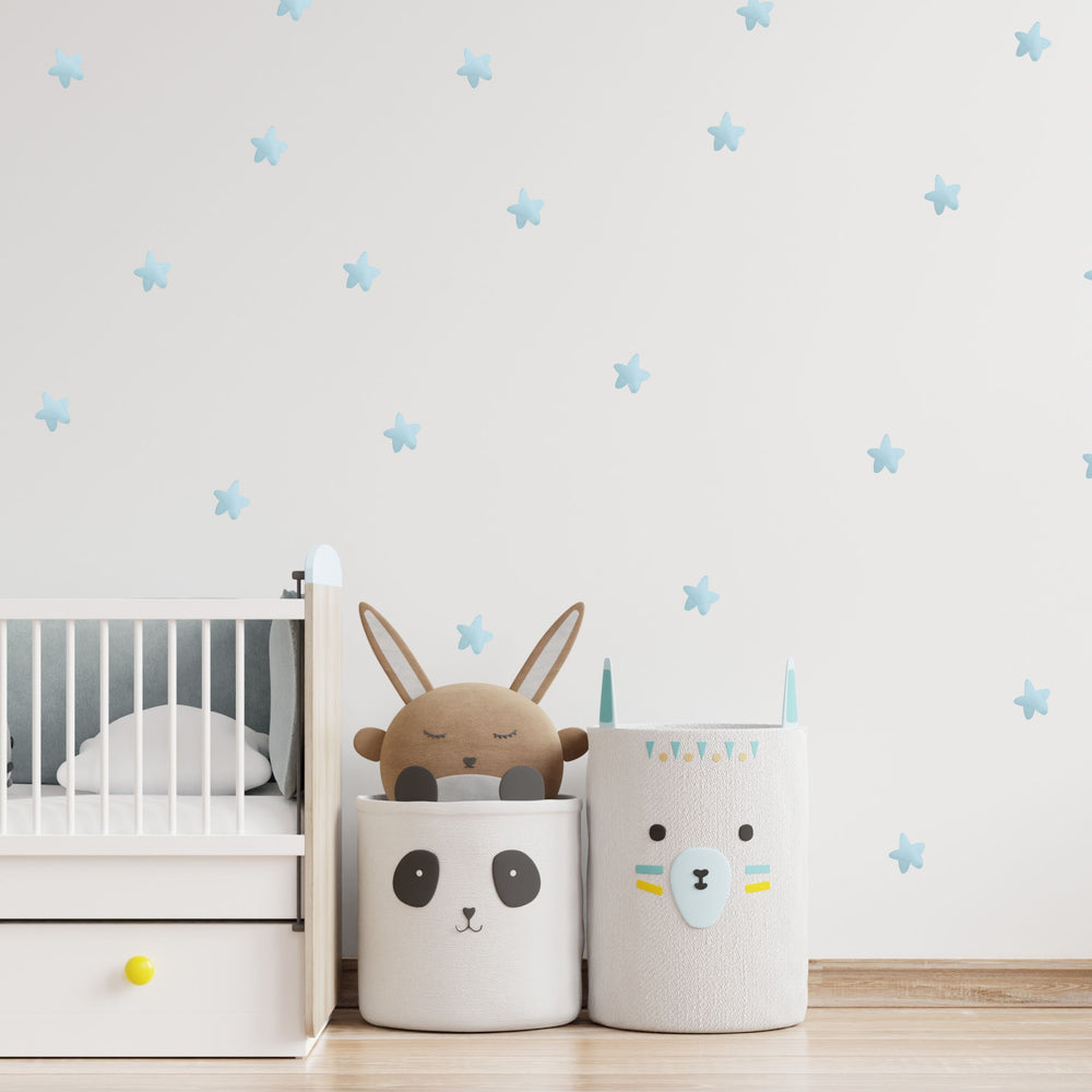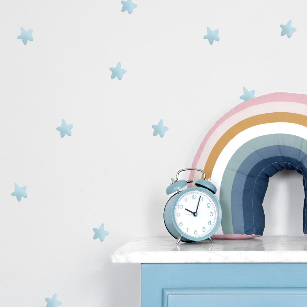 Forvandle barnerommet til en stjernehimmel med selvklebende klistremerker i blå. Stjernene har en dempet blåfarge og wallstickeren ser ut som vannmaling på lerret. Pakken består av 25 stk identiske stjerner som kan festes på vegg, tak, møbler eller døren.