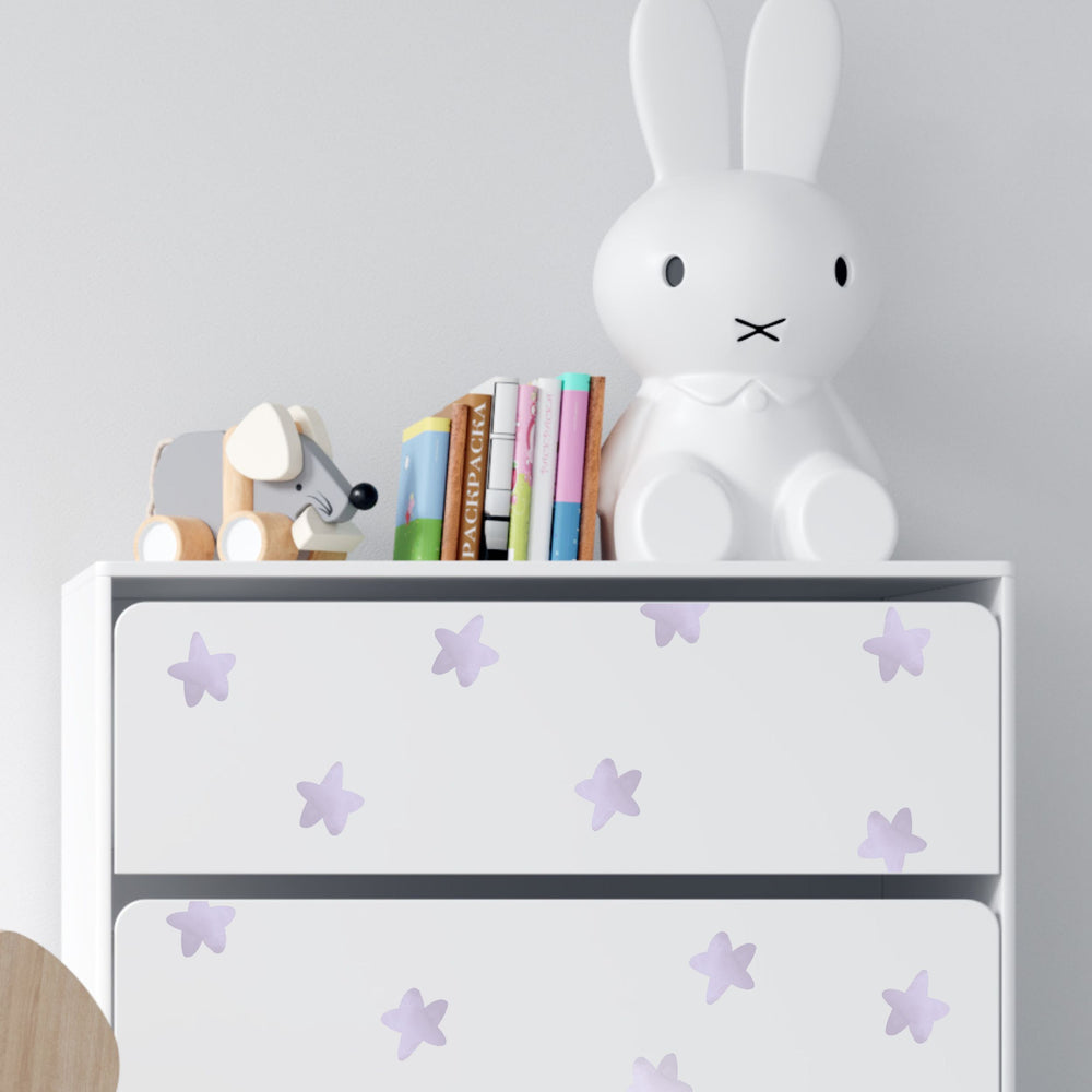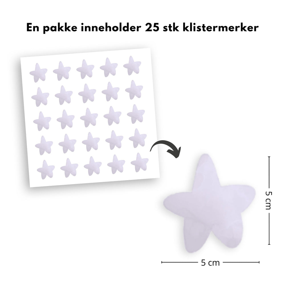 Gjør om barnerommet til en stjernehimmel med selvklebende klistremerker i lilla.  Pakken består av 25 stk identiske stjerner i en rolig lilla farge. Klistremerkene kan festes på vegg, tak, møbler eller døren, og kombineres med en rekke av våre andre barnestickers.