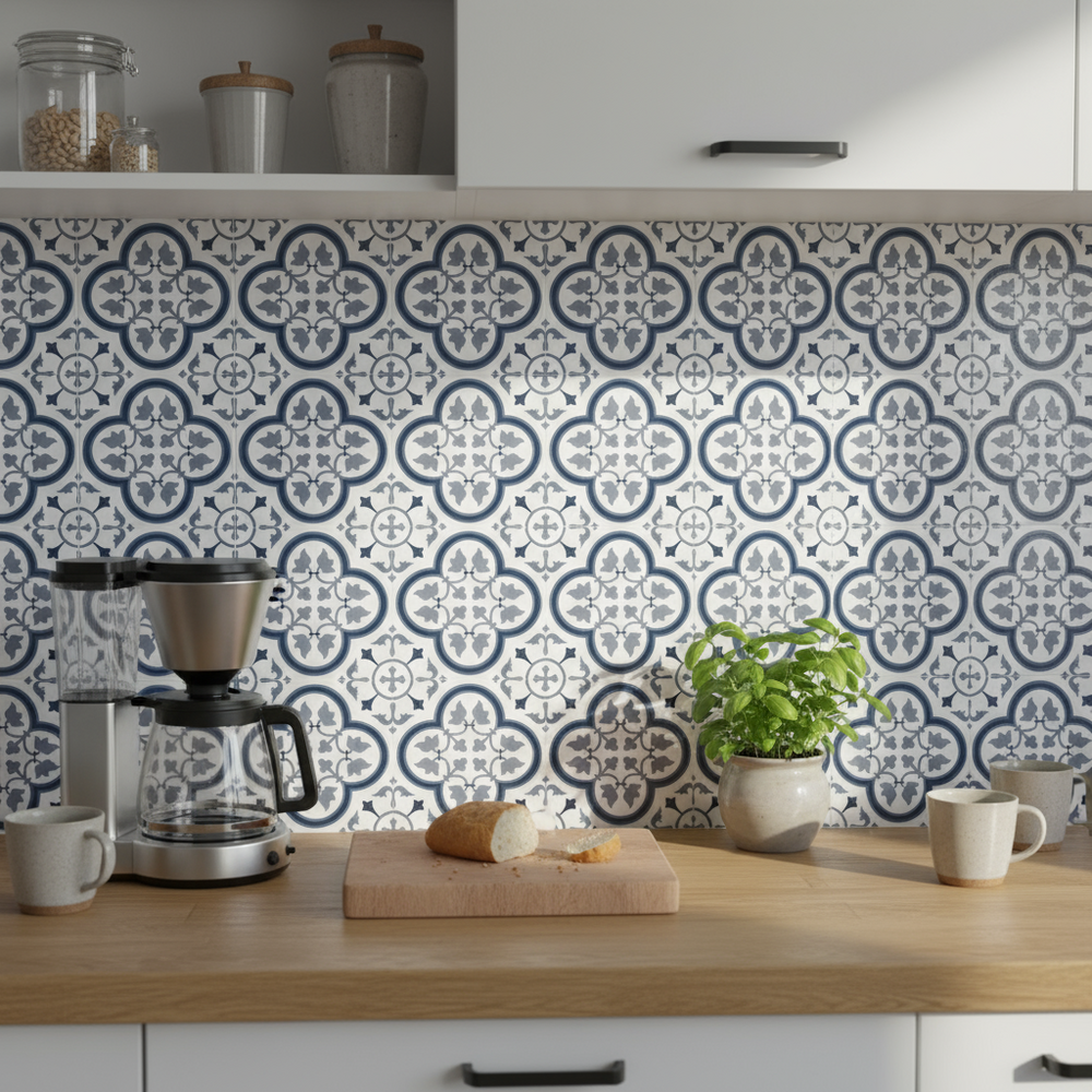 Amanda selvklebende veggfliser har et historisk design i blå, grå og hvit. Disse nydelige flisene har gir hjemmet et unikt og eksklusivt utseende. Flisene har en høyglanset finish og skrå hjørner som gjør at de ser ut som keramiske fliser.