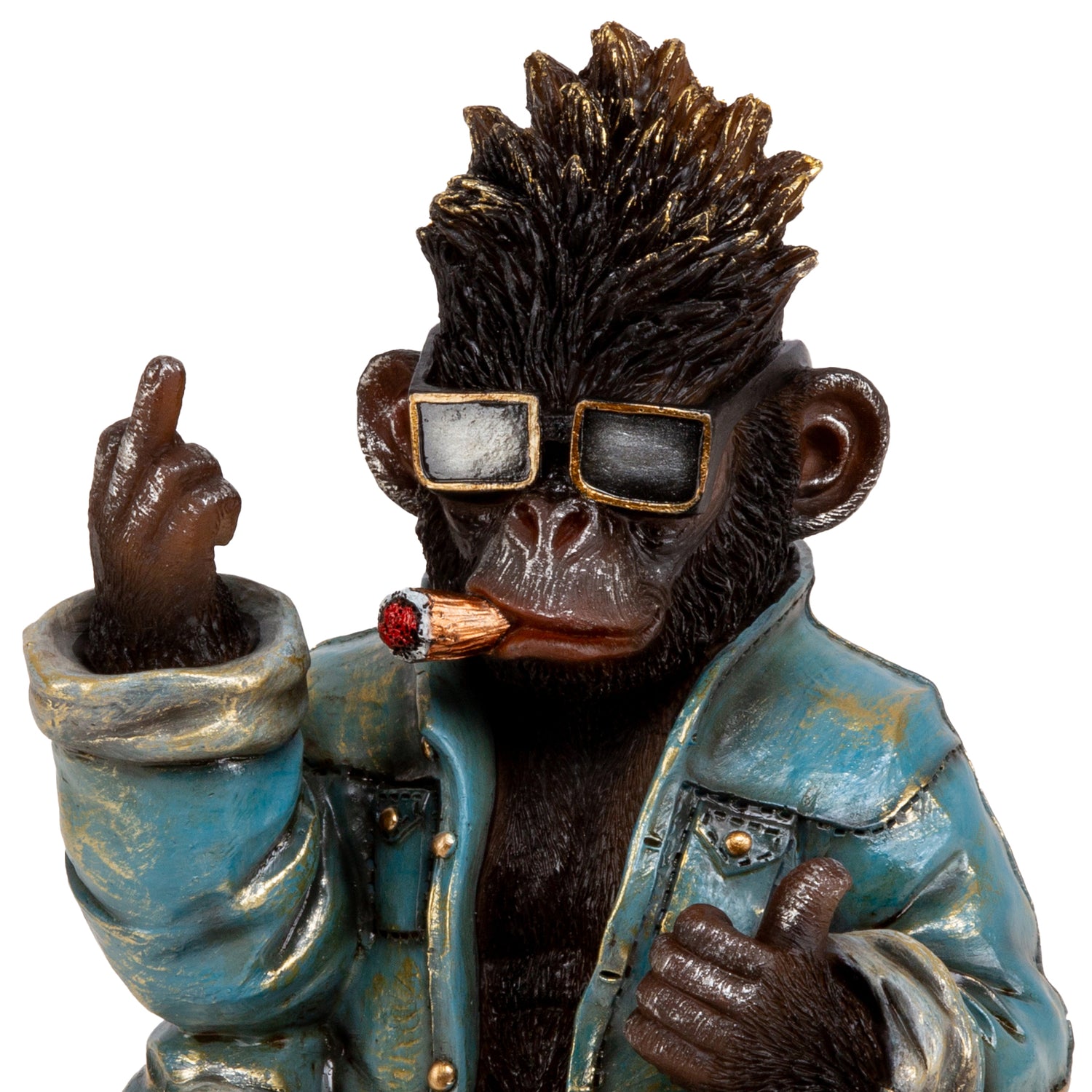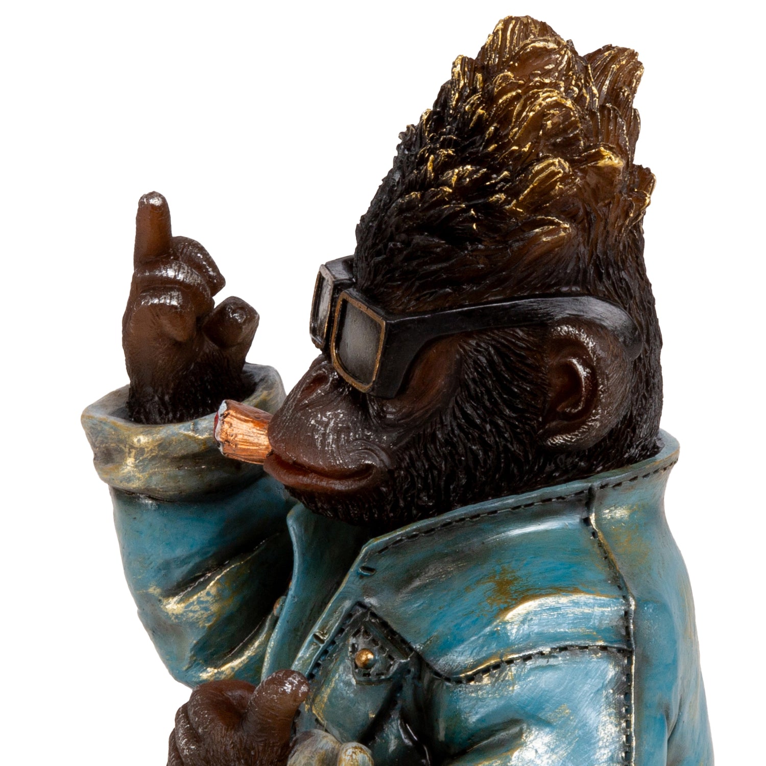 Denne morsomme apefiguren er full av personlighet. Figuren viser en apekatt i blå skinnjakke med solbriller og sigar. En leken og tøff dekor som garantert vekker oppmerksomhet.