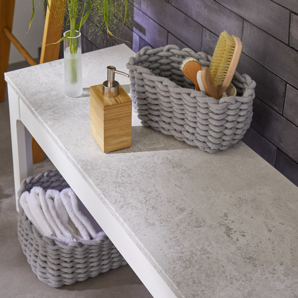 Avellino stone kontaktplast har et lyst steinmønstret design, som etterligner utseendet av naturlig stein eller betong i lysegrå toner.