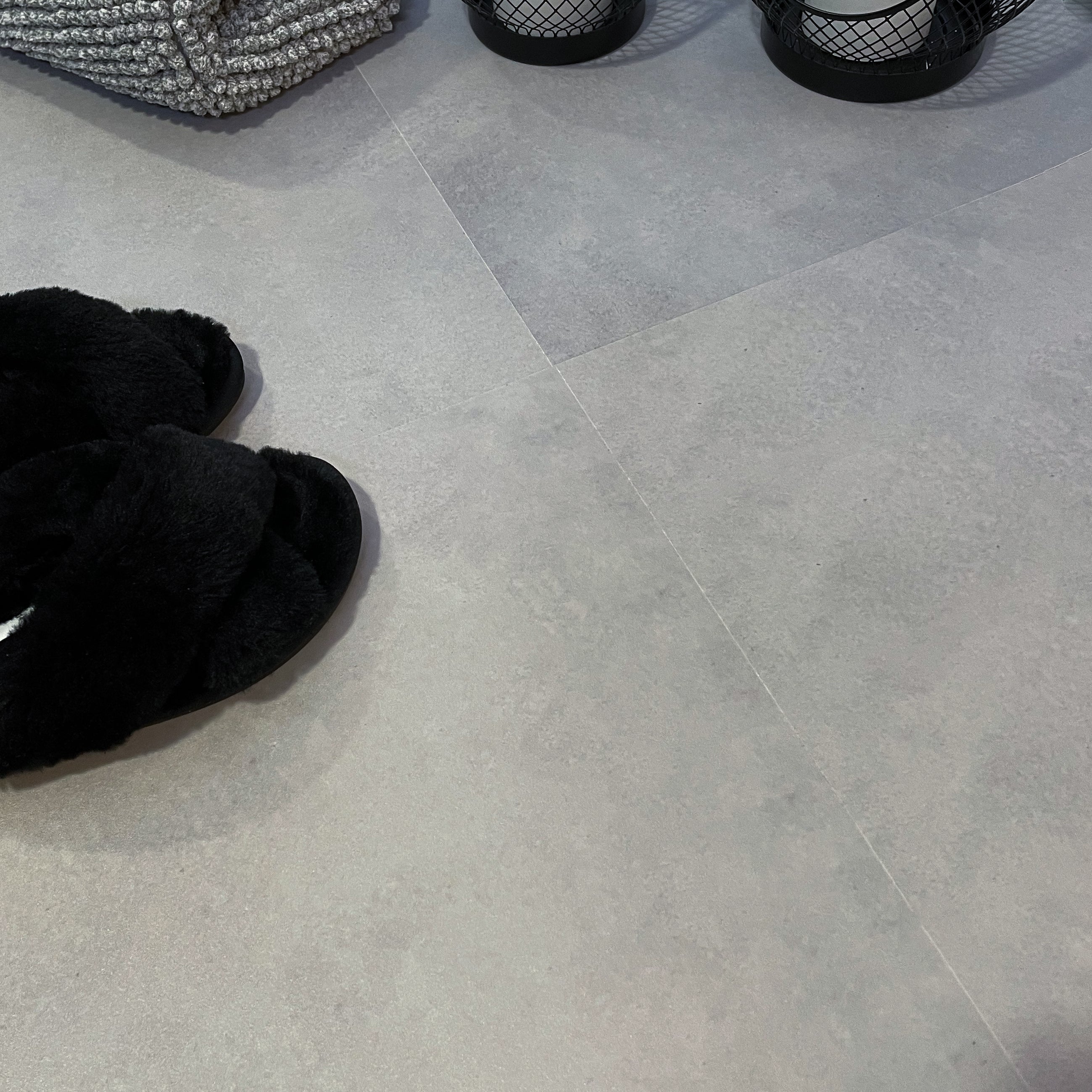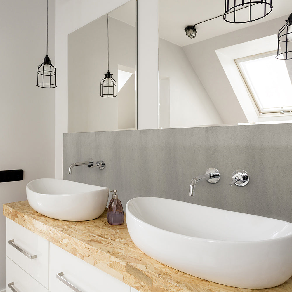 Berlin betong selvklebende fliser på baderomsvegg – moderne og tidløs look.