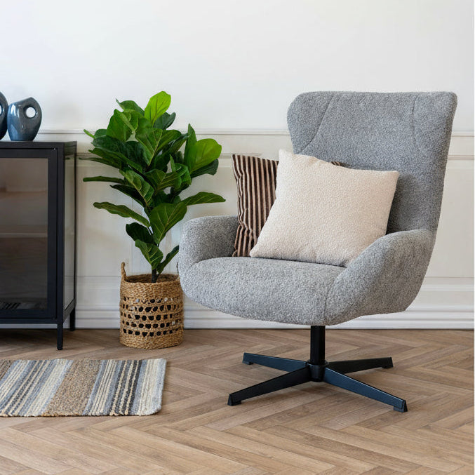 Komfortabel loungestol med svingfunksjon og god støtte i rygg og sete. Den mørkegrå polstringen i tekstil gir et mykt preg, mens metallbasen sikrer stabilitet og enkel bevegelse.