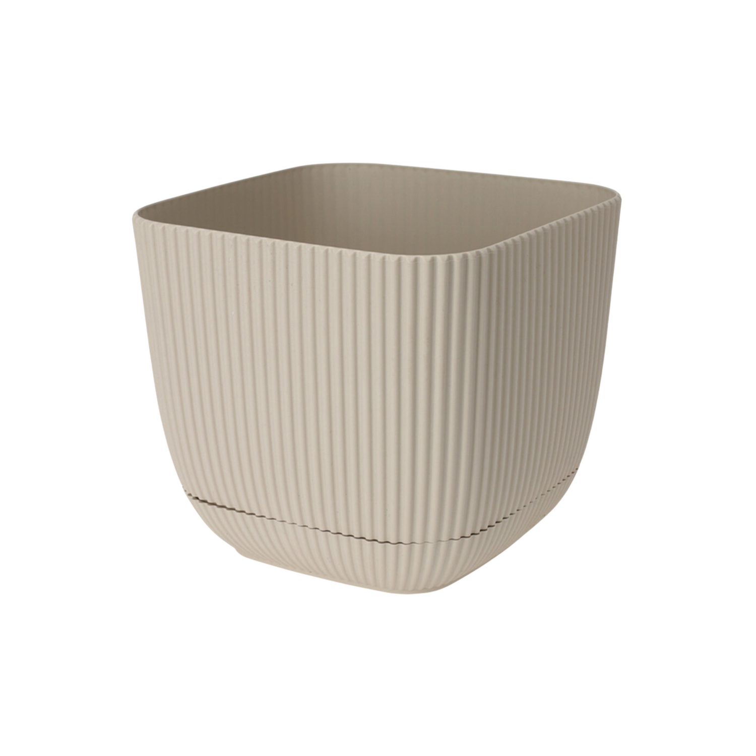 Beige rillet blomsterpotte i plast med avrundet firkantform, uten mål.