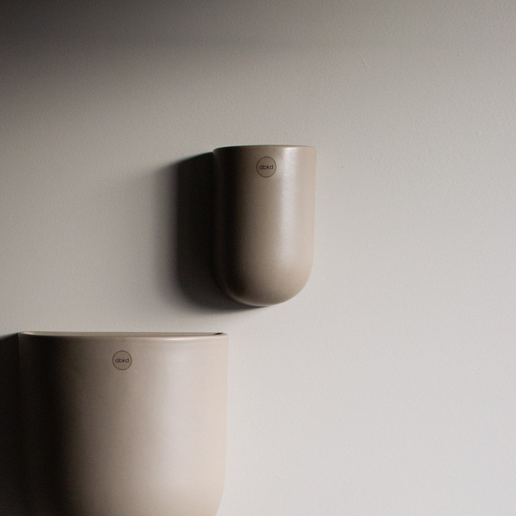 Populær veggpotte fra merket DBKD i fargen dust. Vanntett, keramisk potteskjuler til å henge opp på veggen inne eller ute.