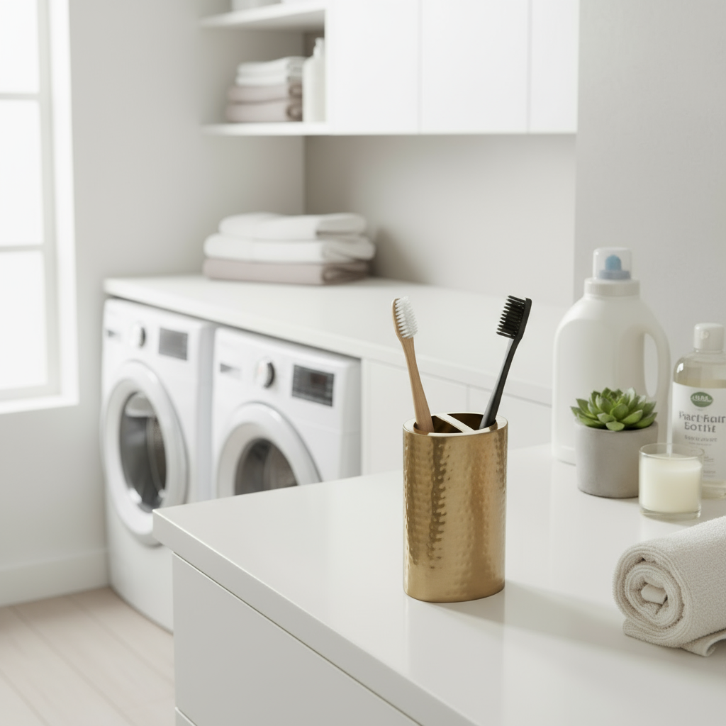 Lutz tannbørsteholder kombinerer glansfull metallfinish med funksjonelt design. Den bronsefargede overflaten gir badet et hint av luksus, samtidig som den er lett å holde ren.