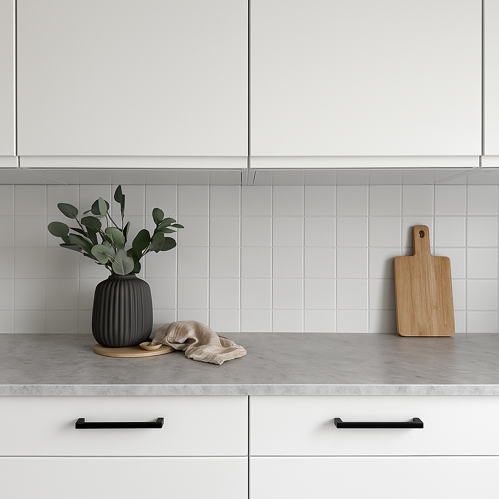 Moderne sorte håndtak montert på hvite kjøkkenskuffer for et stilrent og tidløst uttrykk.
