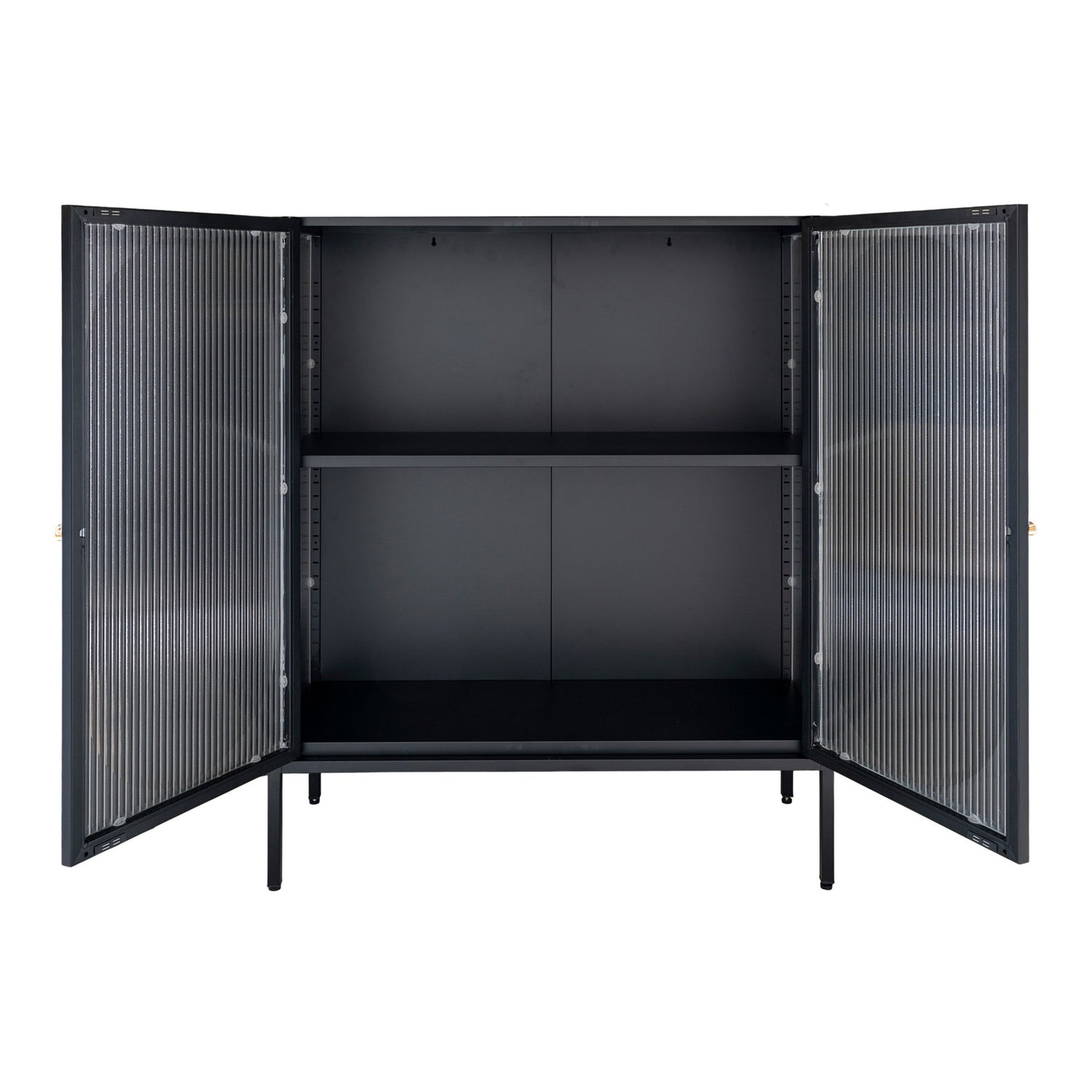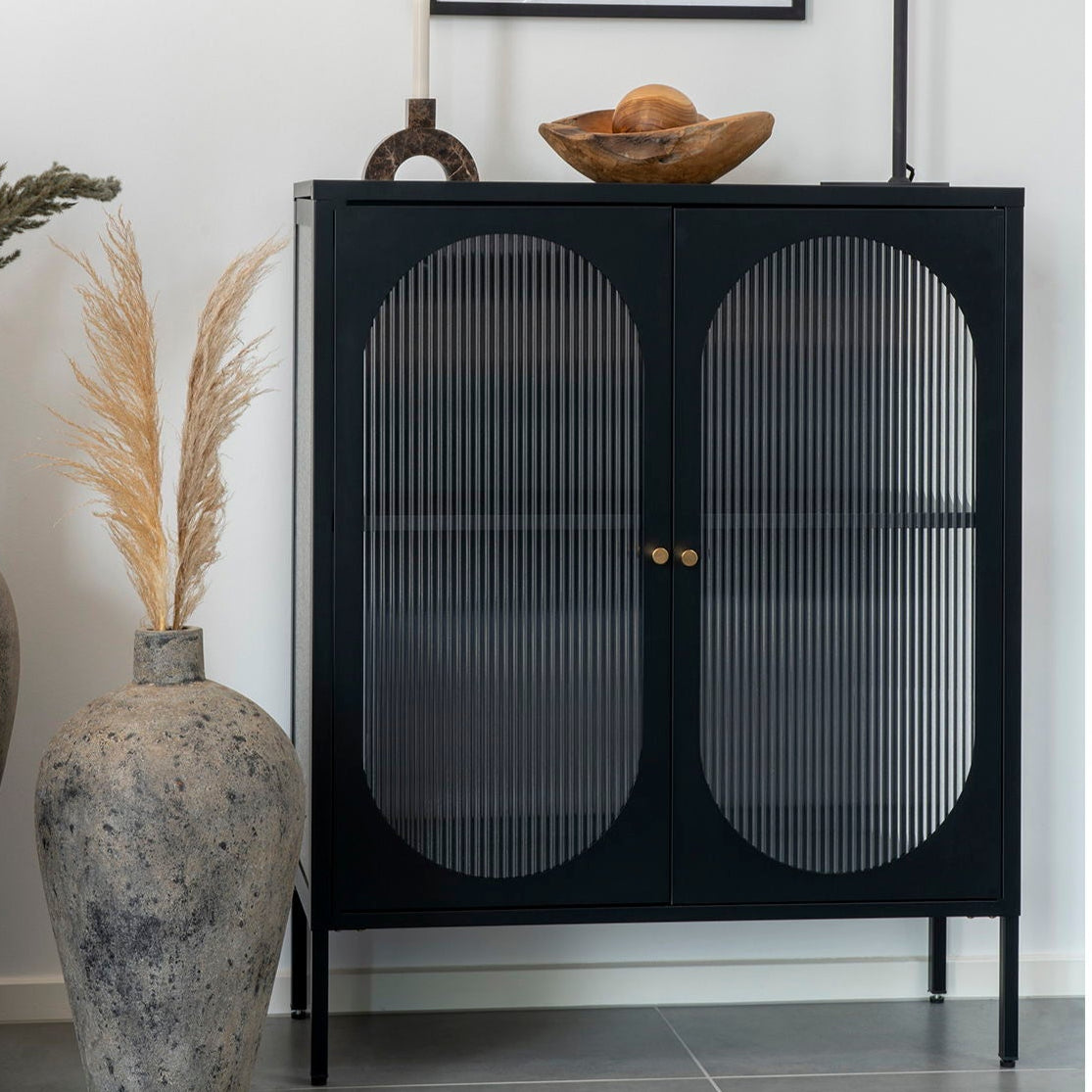 Svart oppbevaringsskap med riflede glassdører og messinghåndtak.