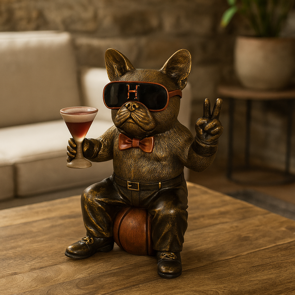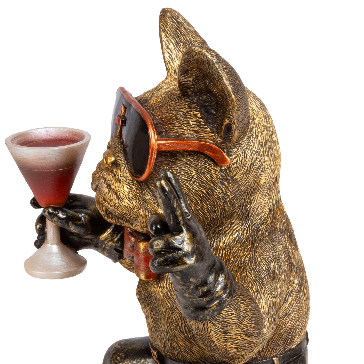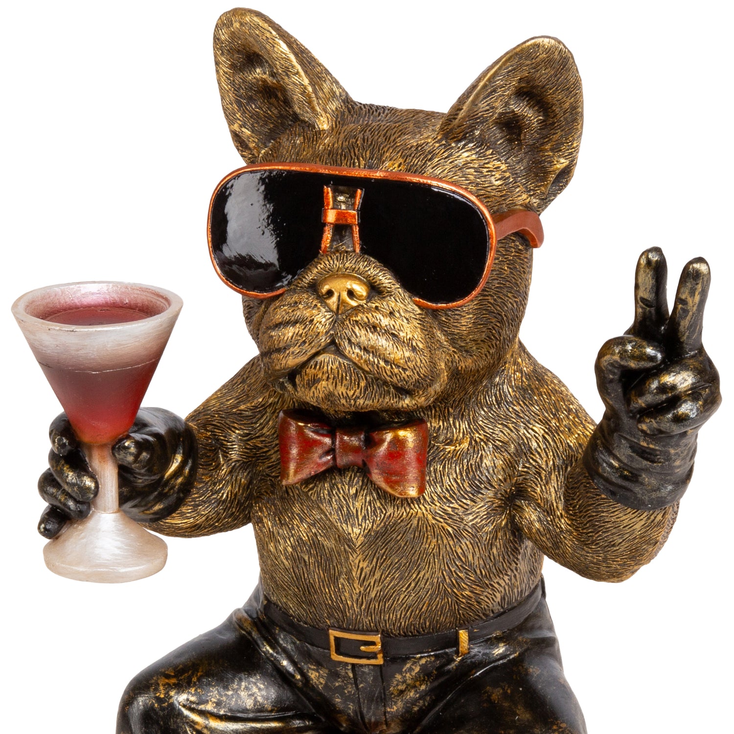 Figuren er laget i polyresin og har en bronsefarget overflate med håndmalte detaljer som gir et levende uttrykk. Plasser den på en hylle, et sidebord eller i barområdet for et artig blikkfang som garantert får folk til å trekke på smilebåndet.