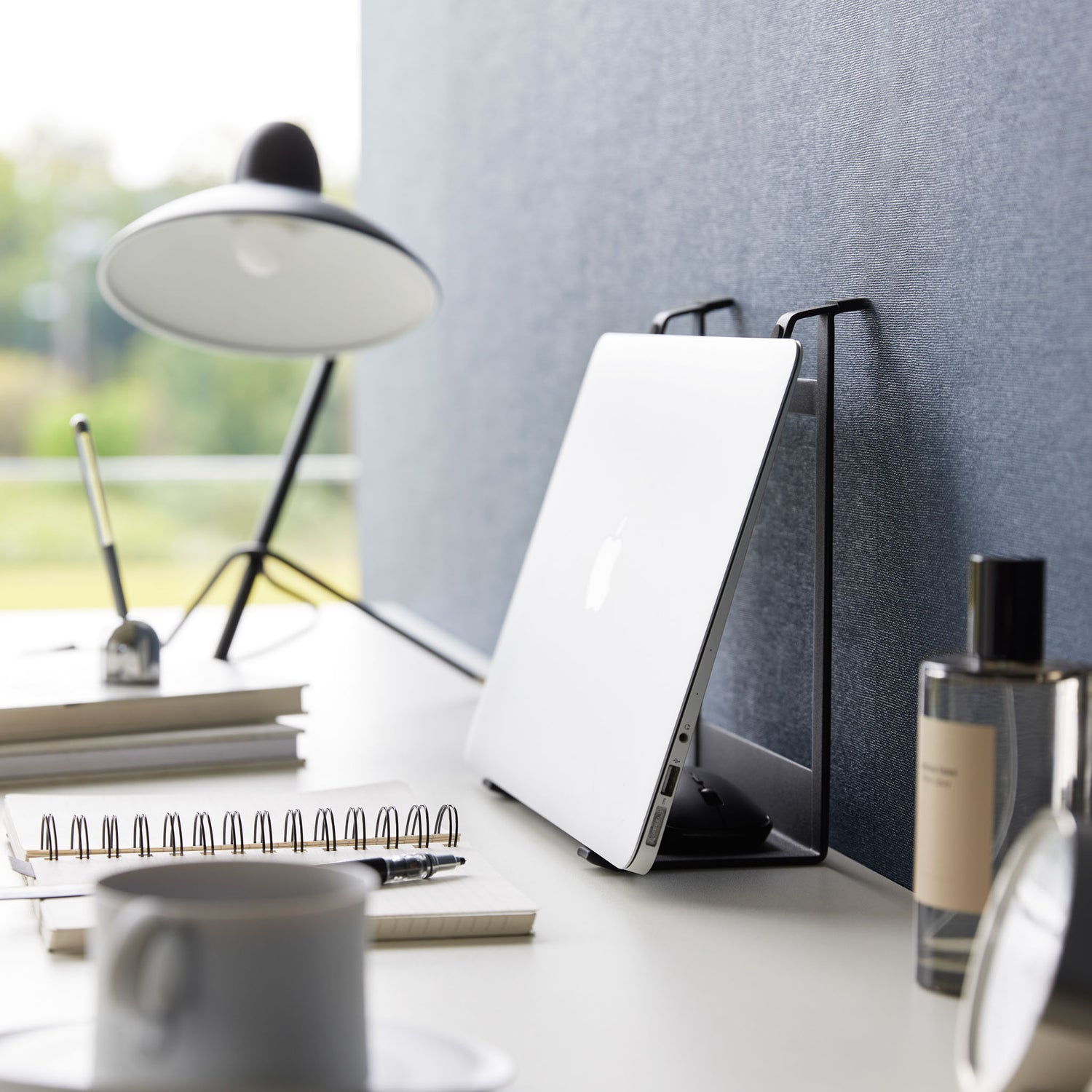 Det solide metallstativet kan brukes liggende eller stående, slik at du enkelt kan tilpasse det til både laptop og nettbrett.