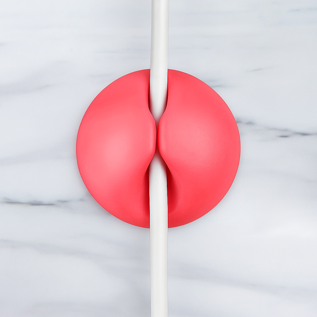 En rund kabelholder i silikon som klemmer rundt en hvit ledning på en marmoroverflate.