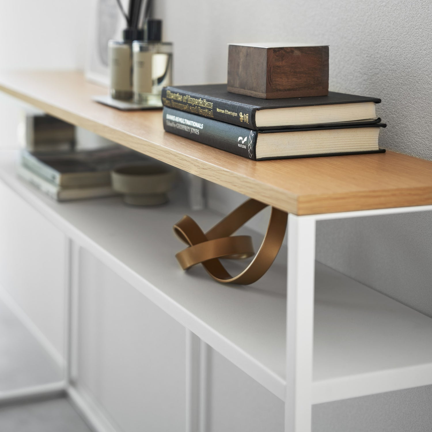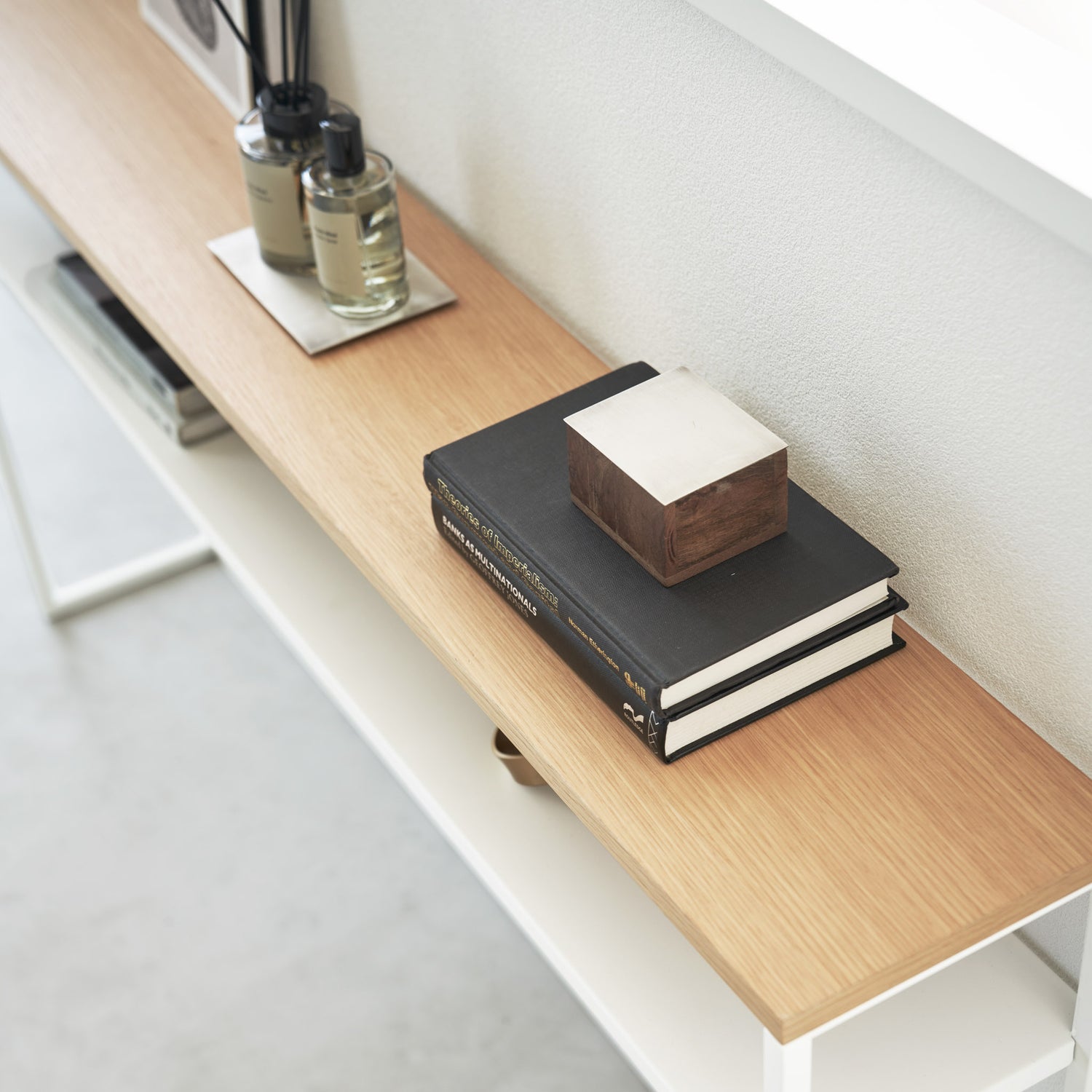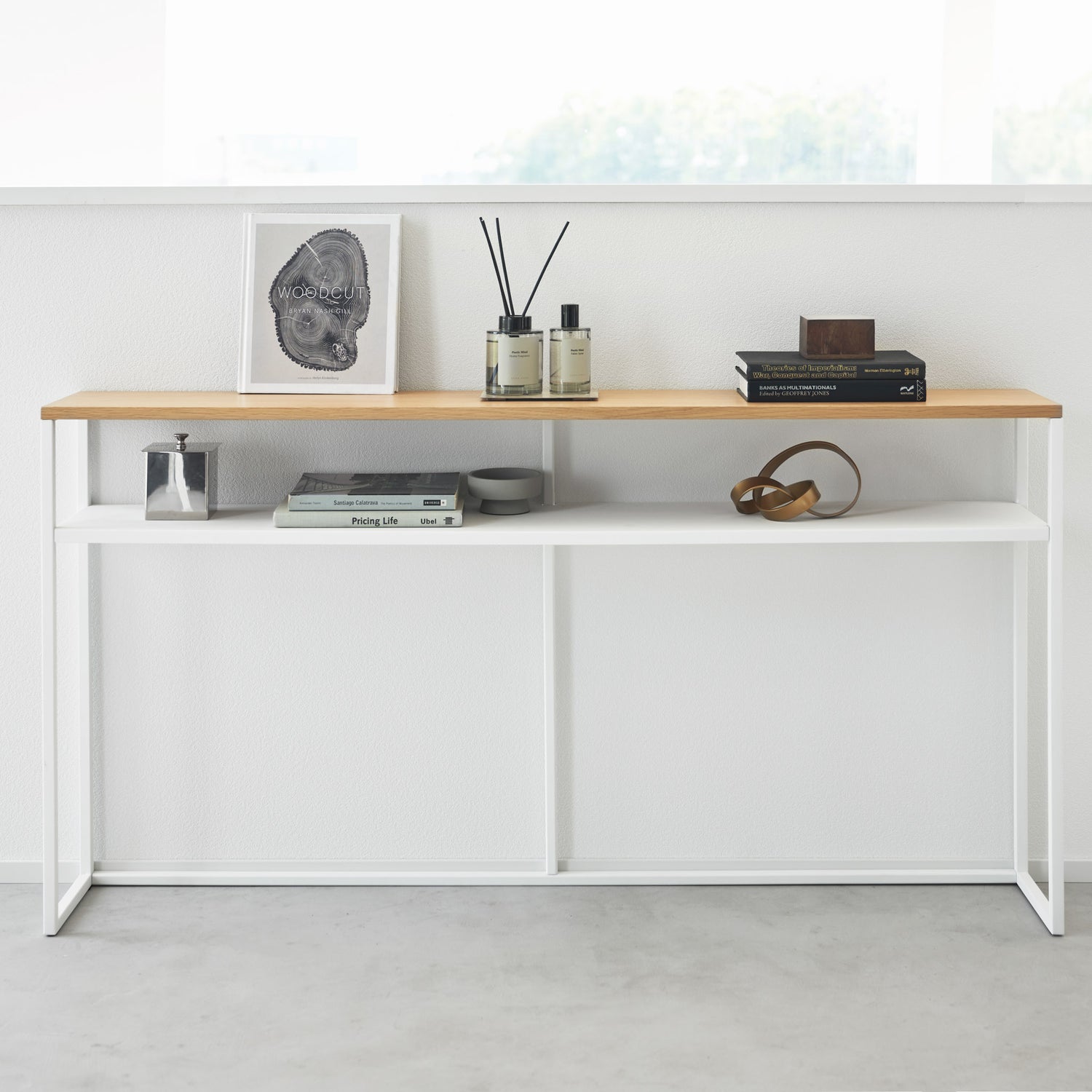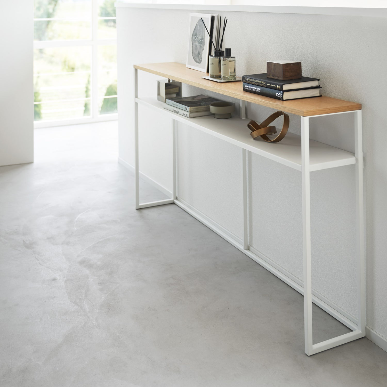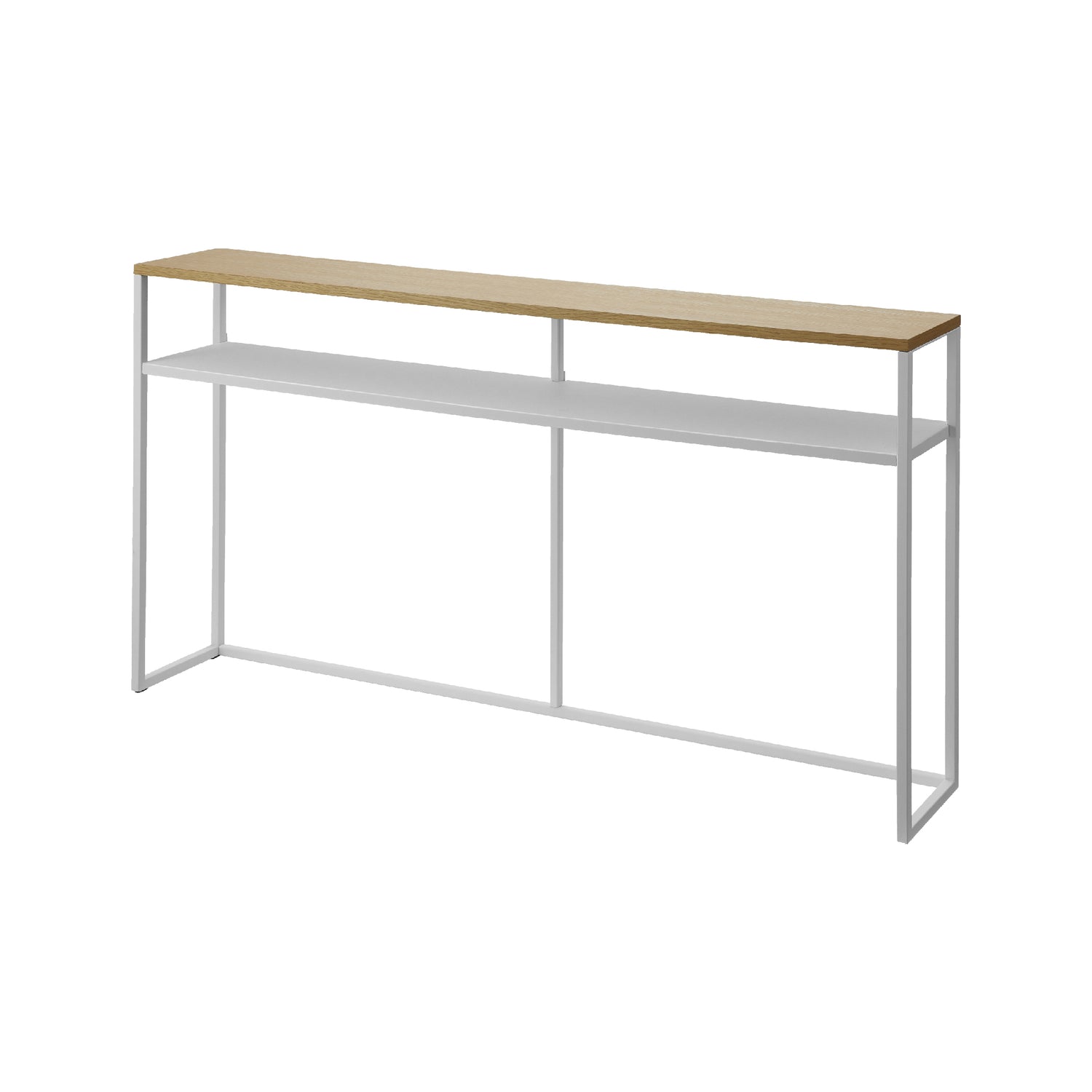 Et praktisk og moderne konsollbord som gir ekstra oppbevaringsplass uten å ta mye rom. Den hvitlakkerte metallrammen gir et lett og luftig uttrykk, mens bordplaten i lyst tre tilfører en varm kontrast.