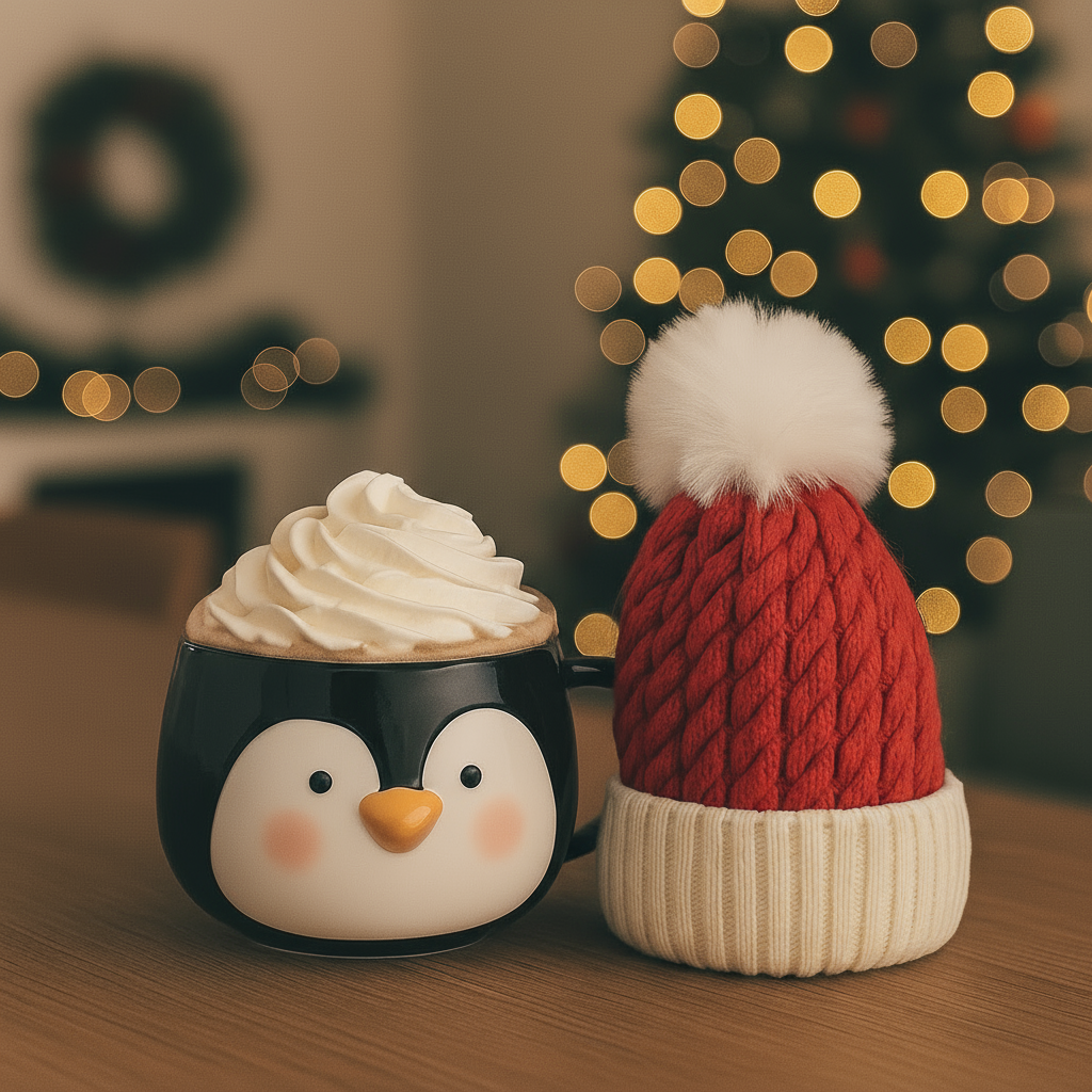 Sort pingvinkopp fylt med kakao og krem, ved siden av rød vinterlue med dusk, foran julelys i bakgrunnen