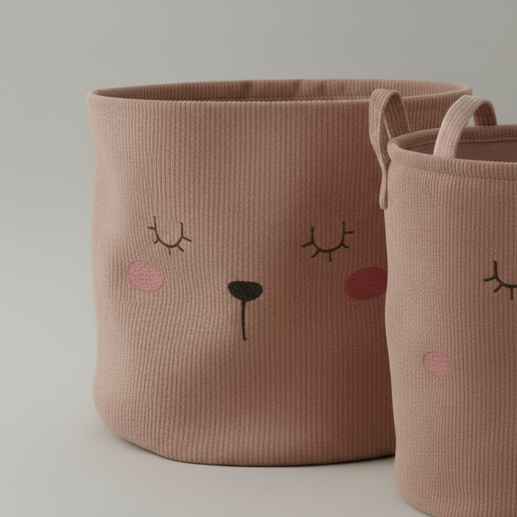 Sett med to myke oppbevaringskurver i cordstoff med dyremotiv, perfekt til barnerom eller stue.