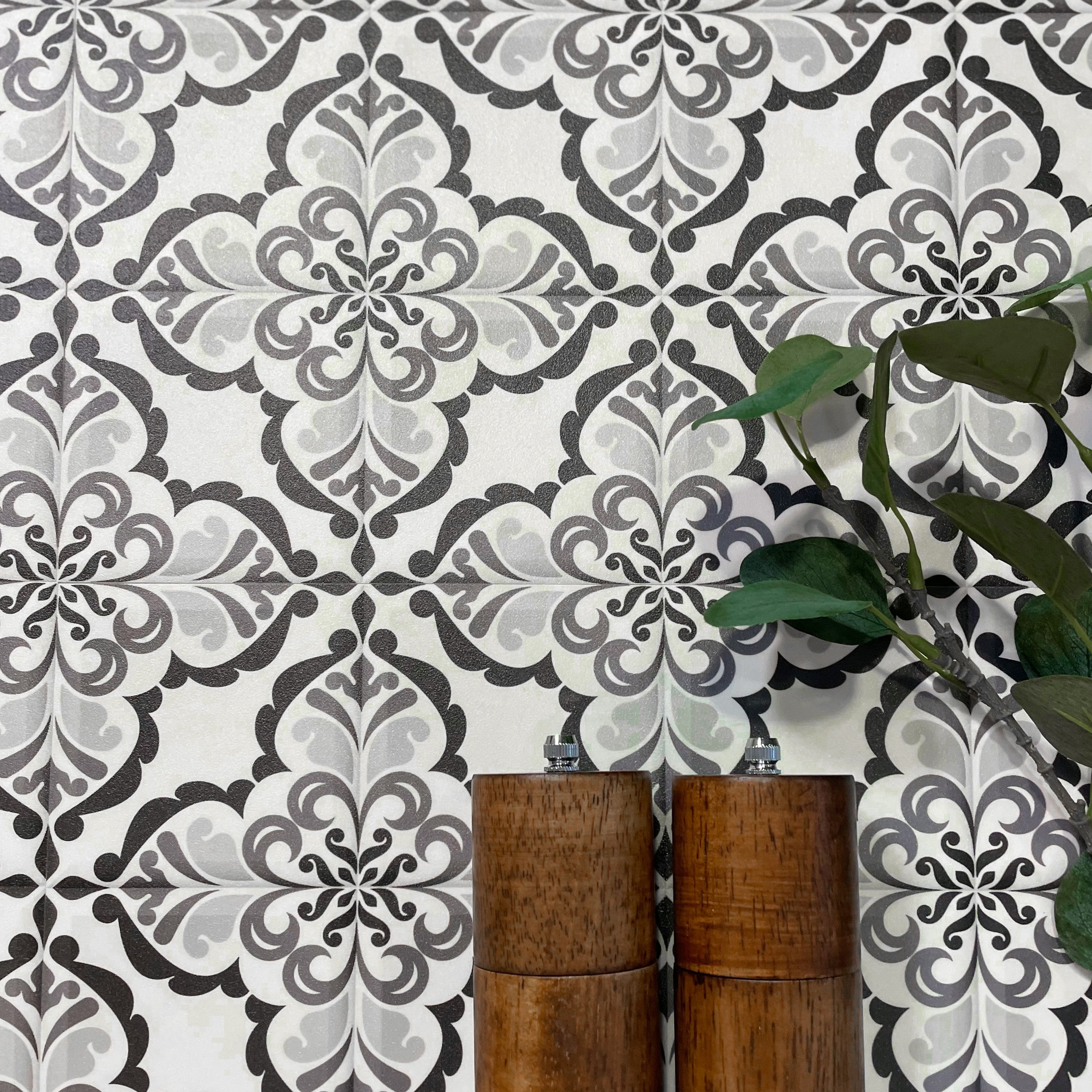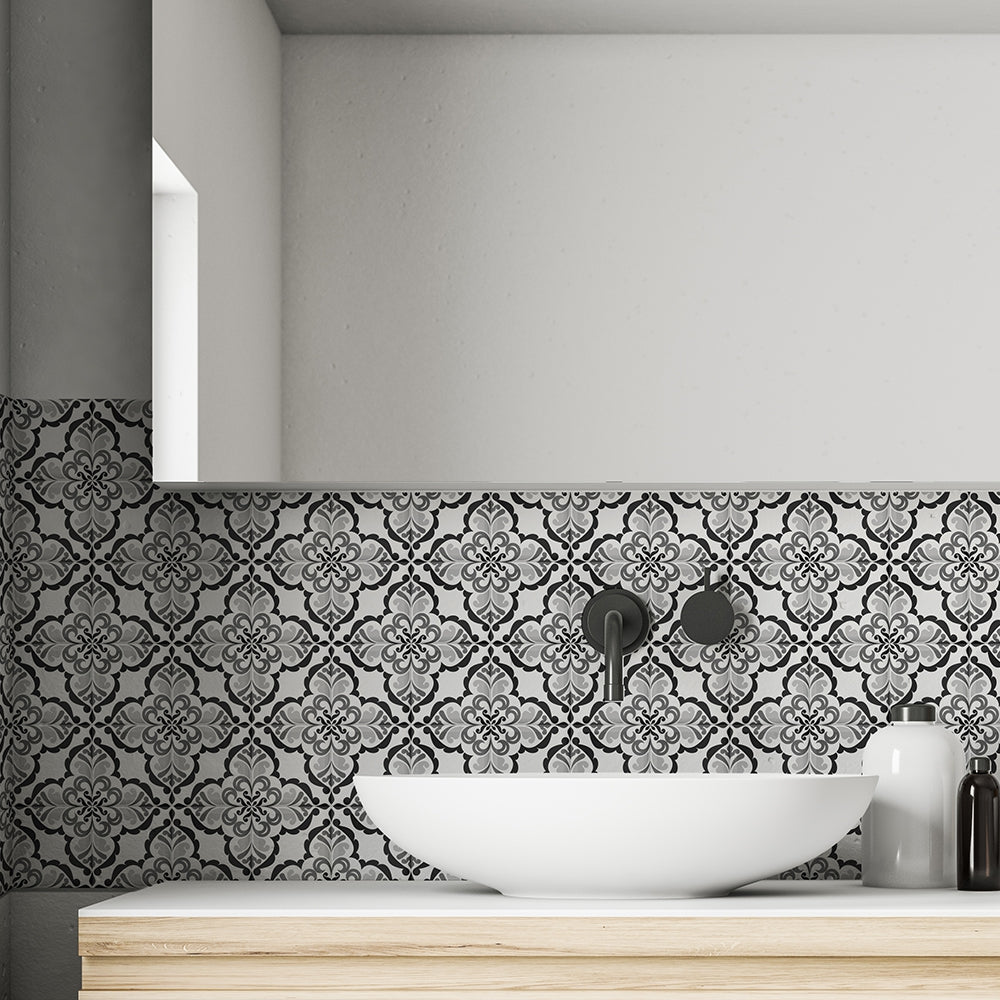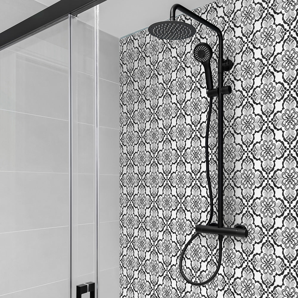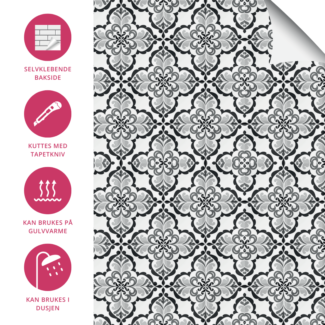 Lisbonne selvklebende fliser har et nydelig vintage design vintage mønster i hvit og sort, og ser like fine ut på gulv som på vegg.