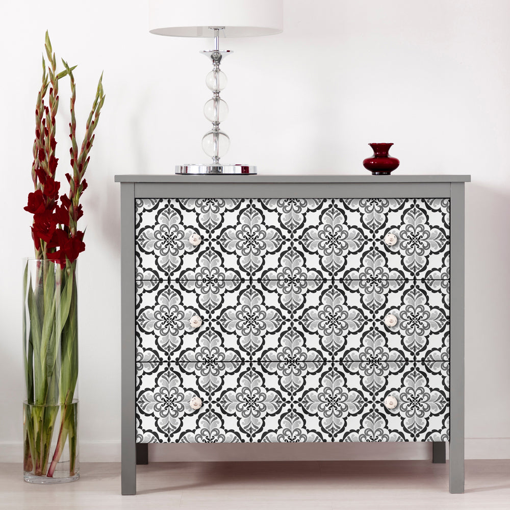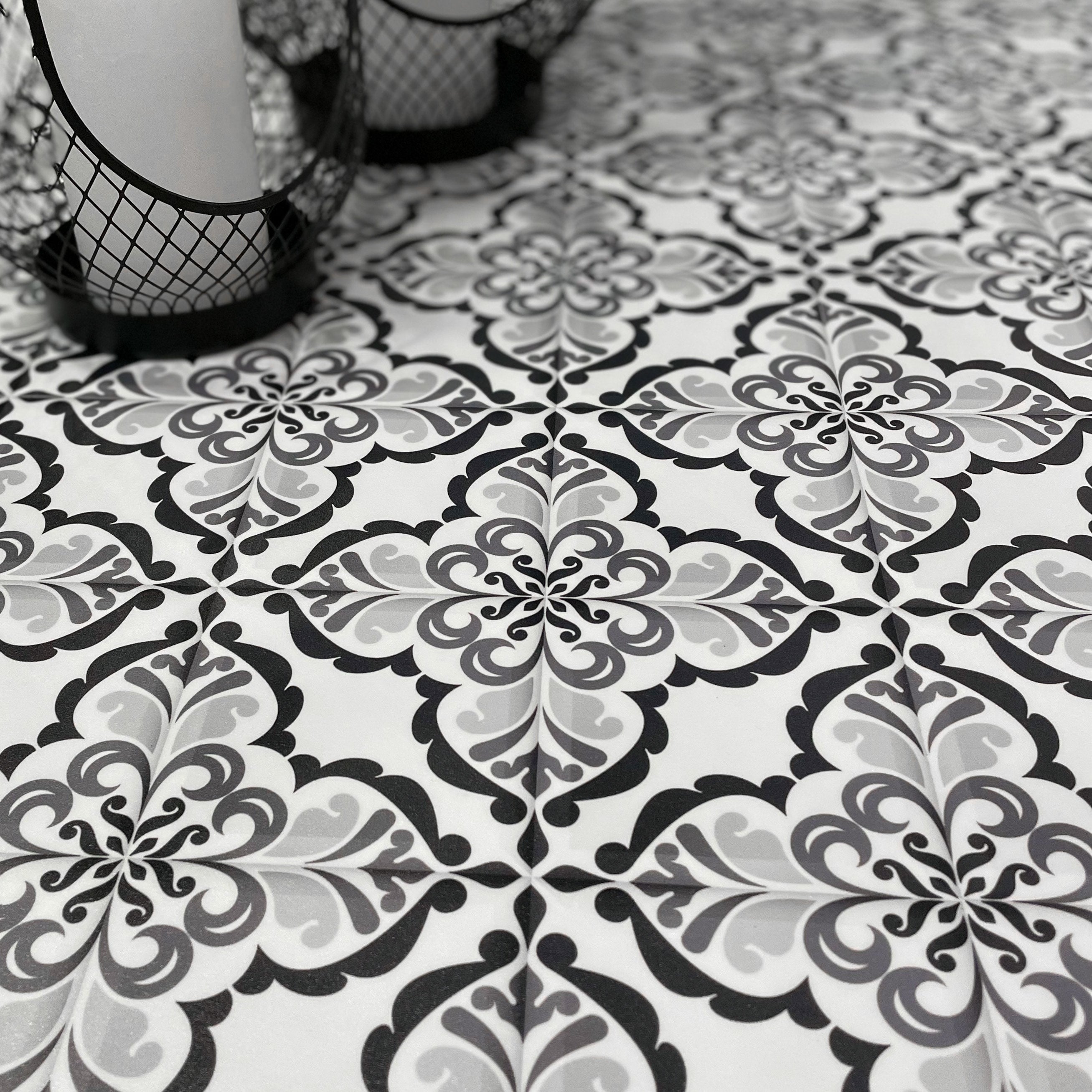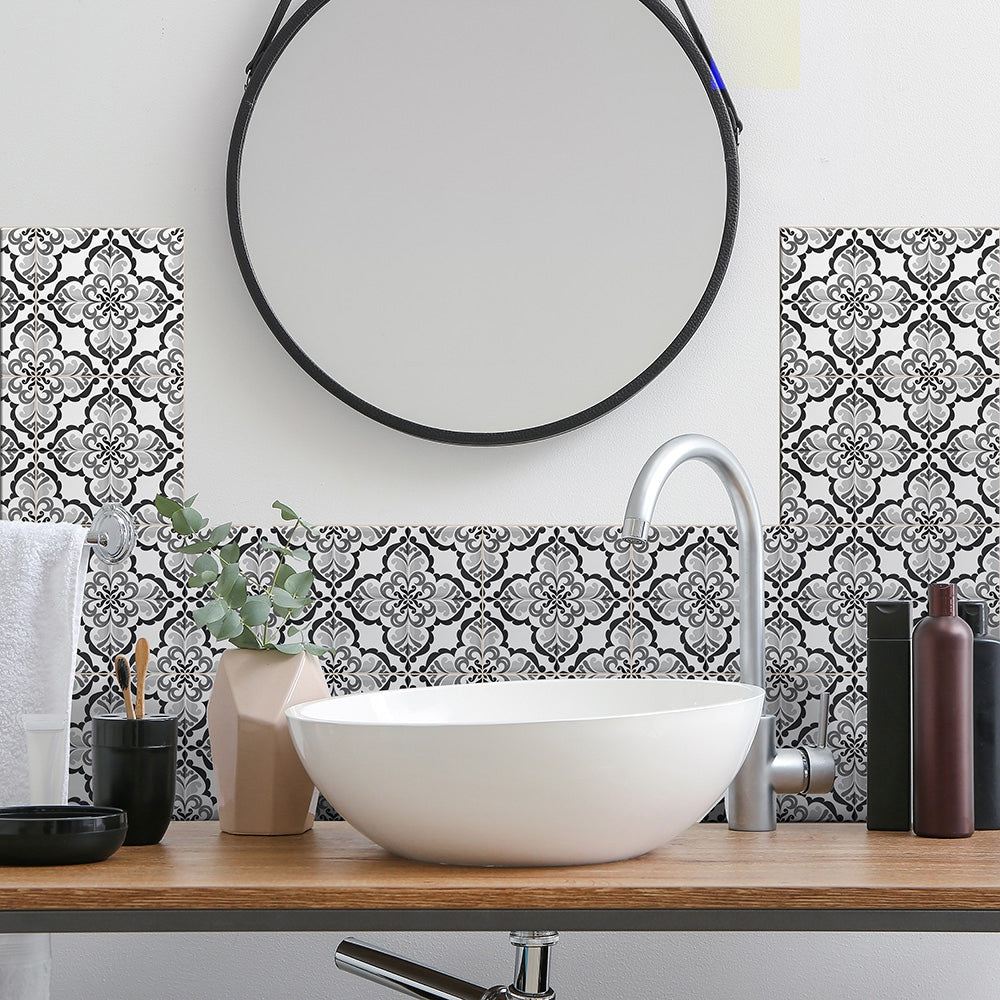 Lisbonne selvklebende fliser har et nydelig vintage design vintage mønster i hvit og sort, og ser like fine ut på gulv som på vegg.