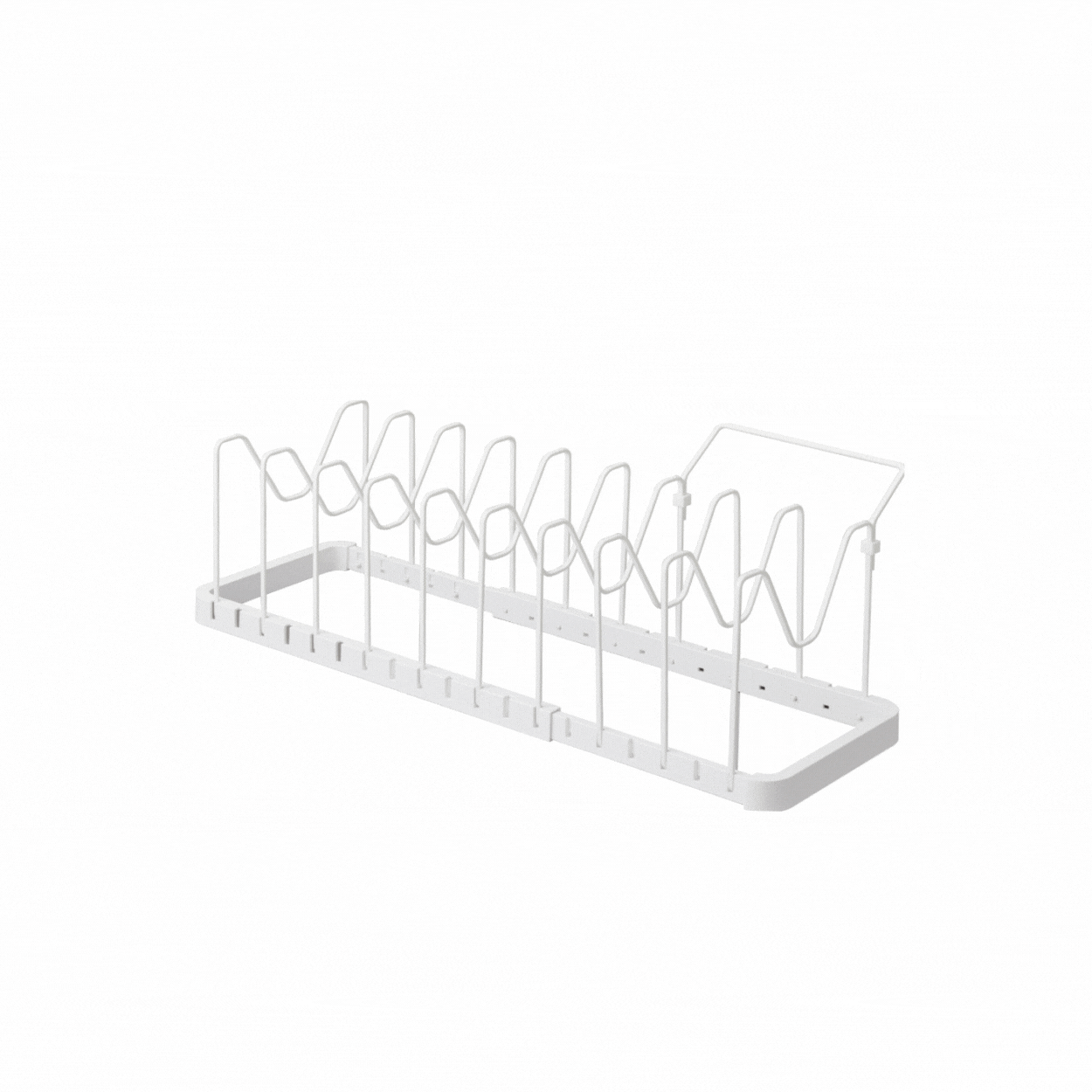 Dette praktiske lokk- og panne-stativet i hvitt hjelper deg med å holde kjøkkenet organisert og ryddig. Med justerbare seksjoner gir det fleksibel oppbevaring for både lokk, stekepanner og kasseroller.