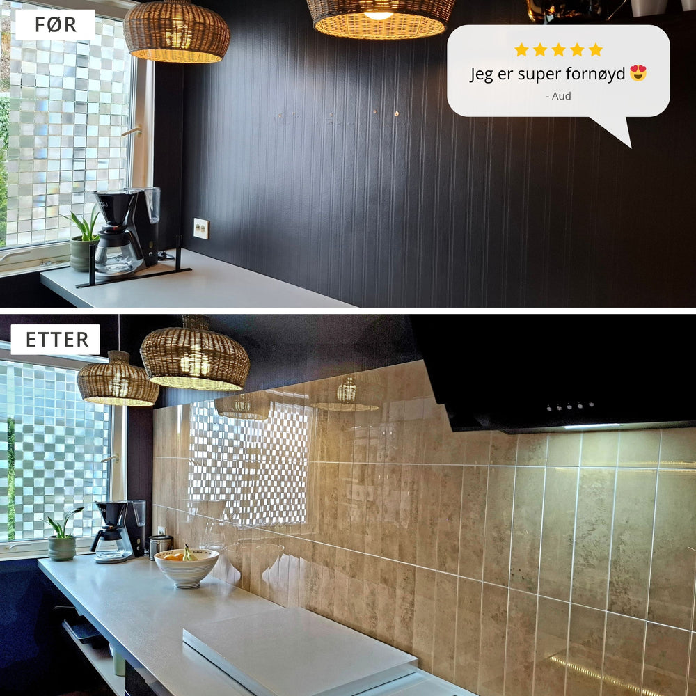 Varme beige veggfliser til kjøkken og bad. Selvklebende fliser.