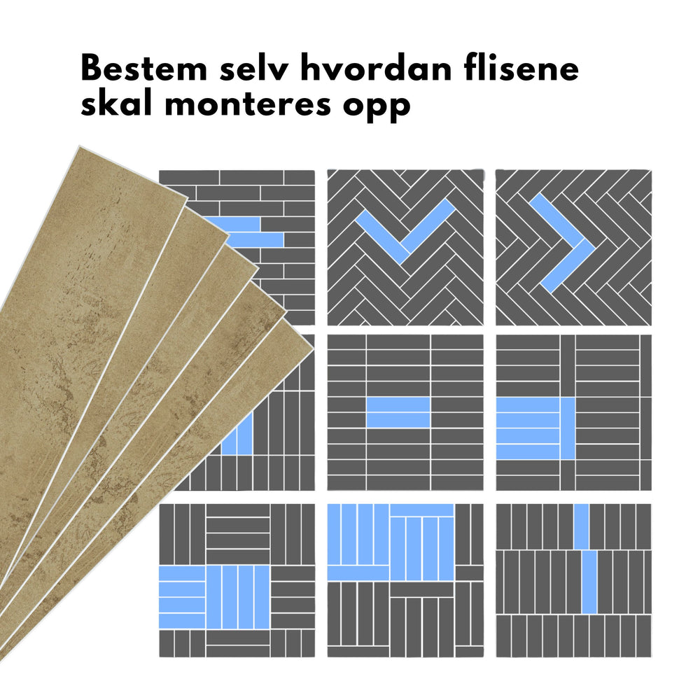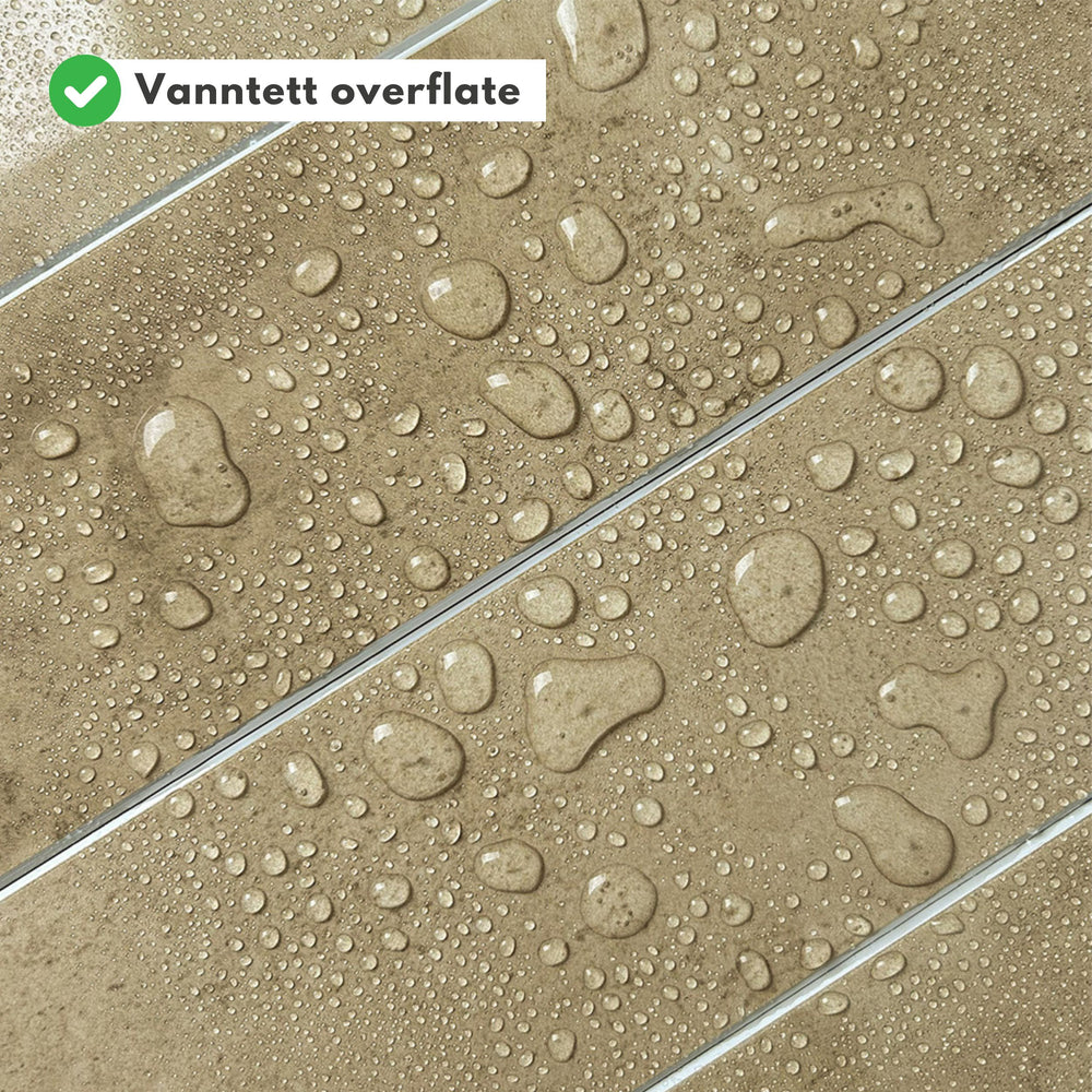 Du sparer både tid og penger med selvklebende veggfliser. Flisene monteres direkte på din eksisterende vegg, og er perfekt som sprutvegg og ellers på kjøkken, bad, vaskerom og gang.