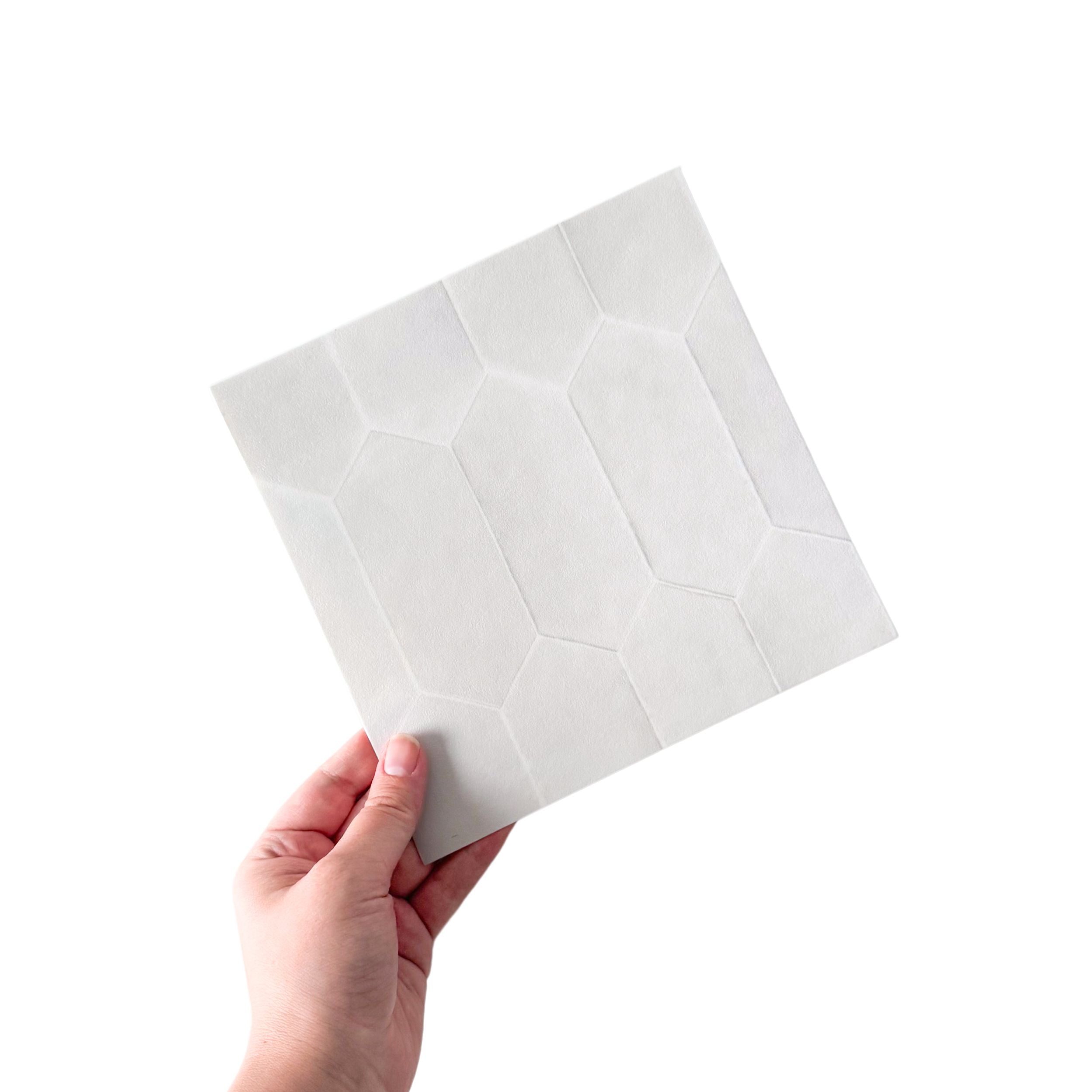 Mathilde lysegrå selvklebende fliser imiterer fliser i et hexagonalt mønster i en behagelig hvit tone. Passer til å fornye kjøkken og bad.
