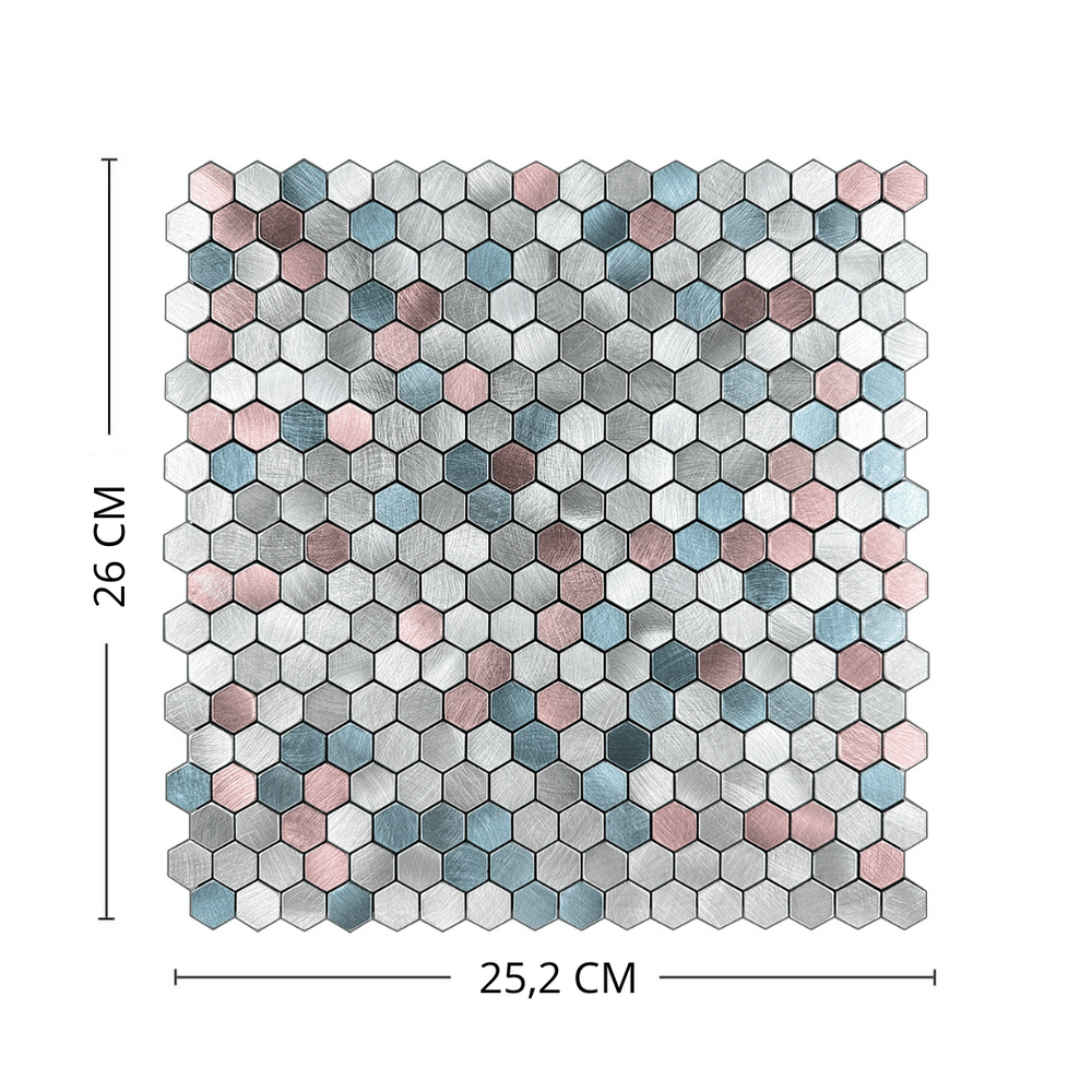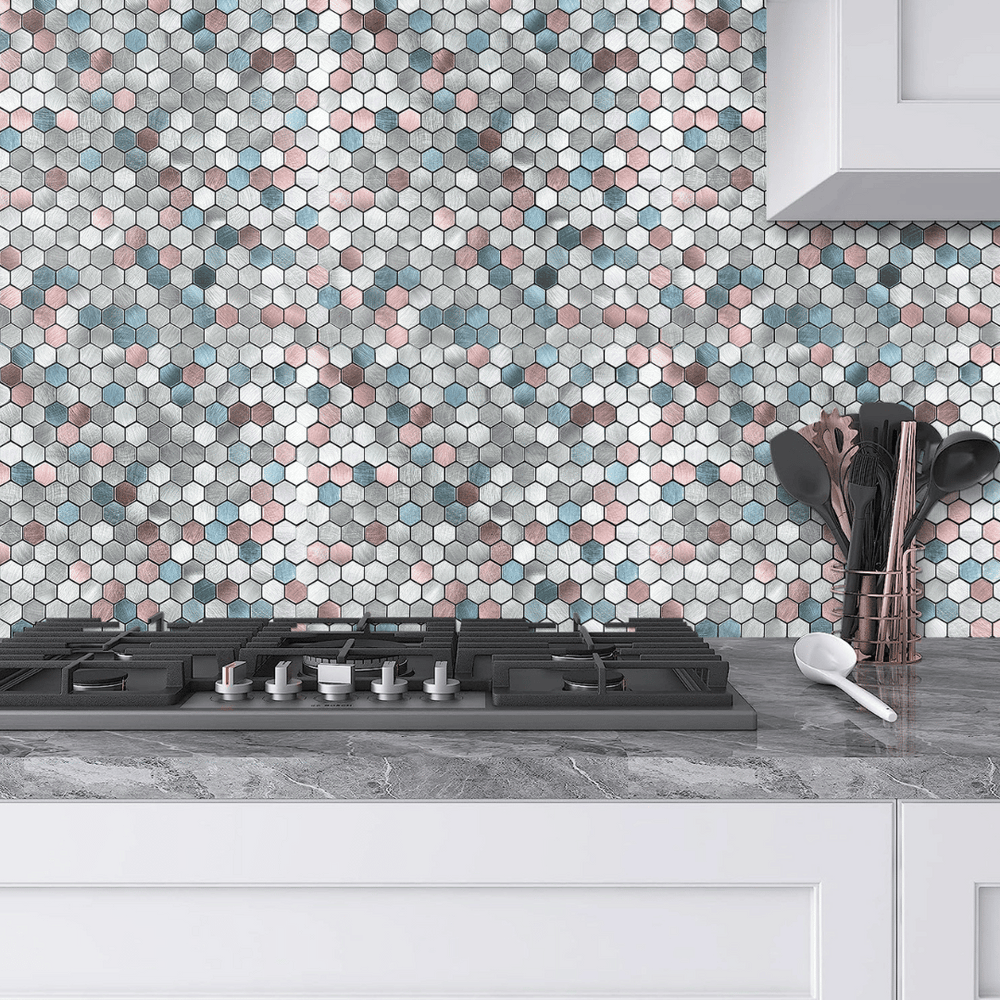 elvklebende mosaikkfliser i sekskant med metallisk effekt i sølv, rosa og blå – moderne veggfliser til kjøkken og bad
