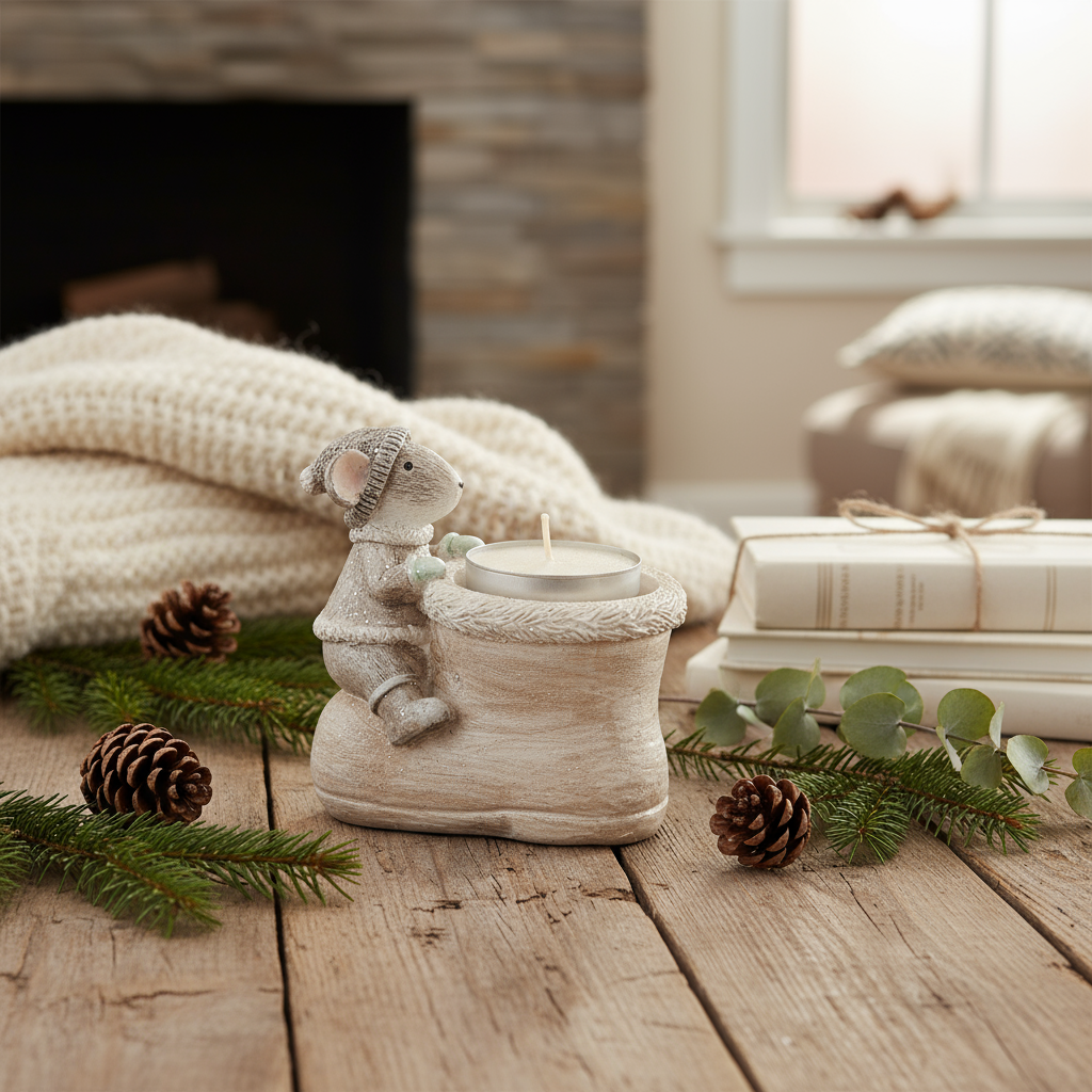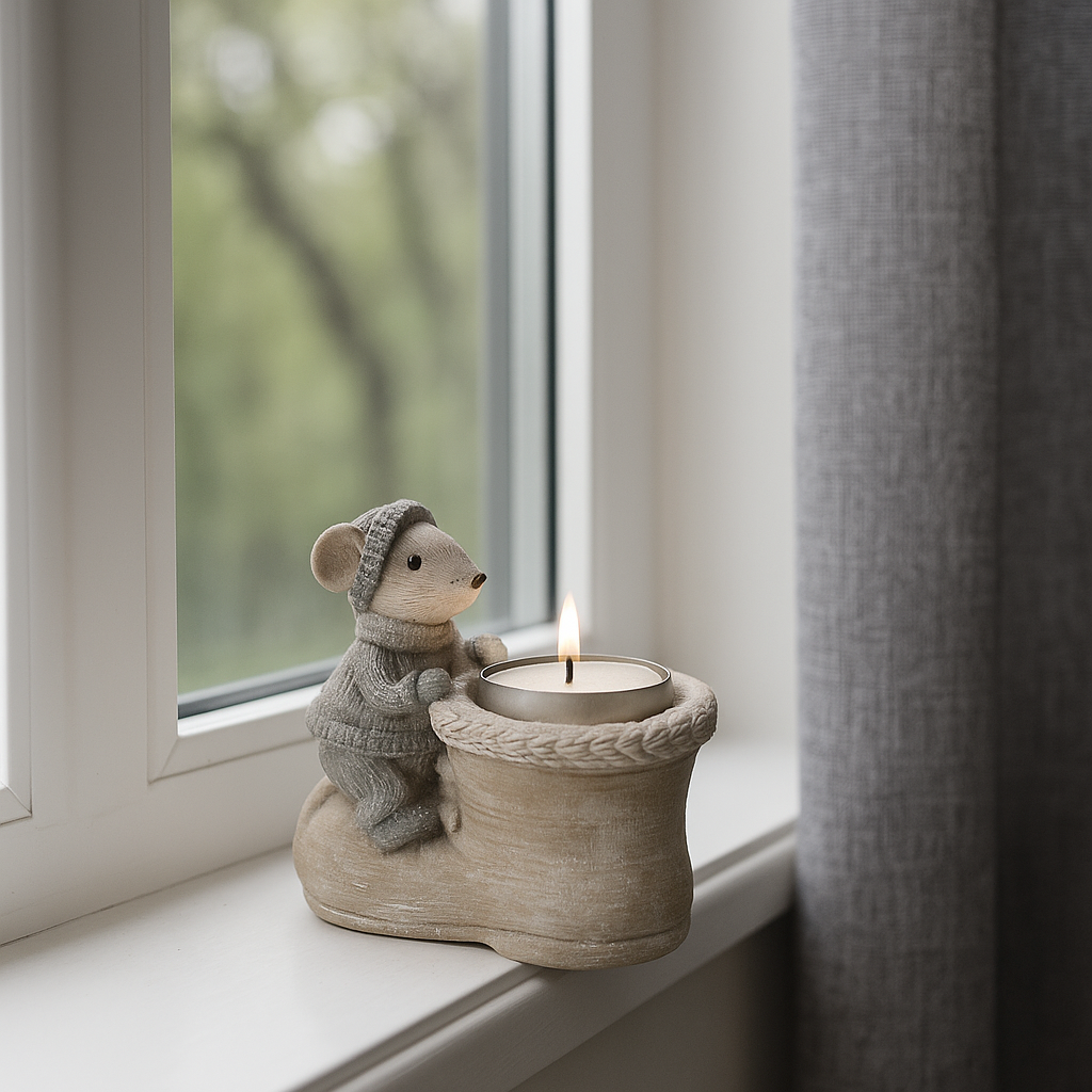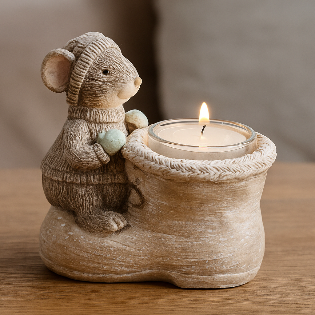 Skap en koselig og lun stemning med denne sjarmerende telysholderen. Figuren forestiller en liten mus i grå drakt som sitter ved en rustikk sko som fungerer som lysestake. Den søte og detaljerte utformingen gjør den perfekt som dekor på bord, hylle eller vinduskarm.