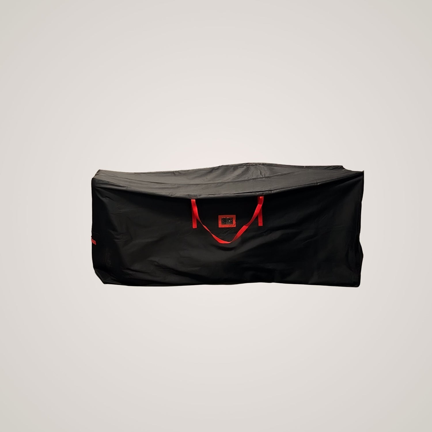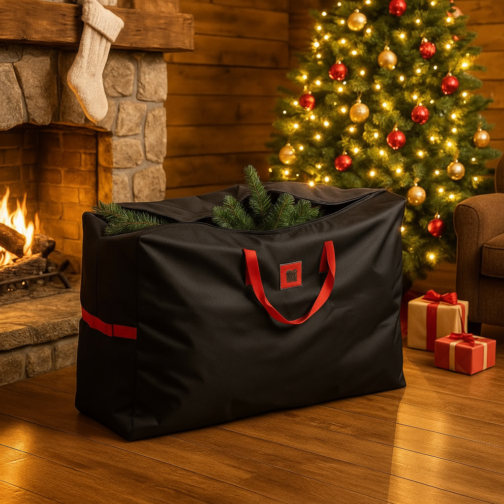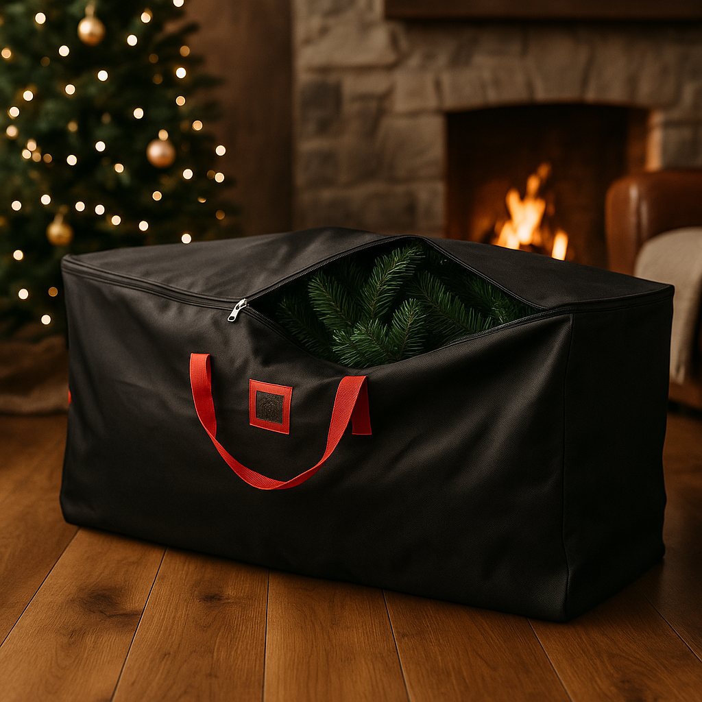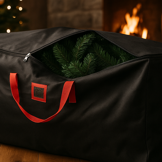 Svart oppbevaringsbag for juletre i solid stoff med røde detaljer, fotografert i naturlig kveldslys.