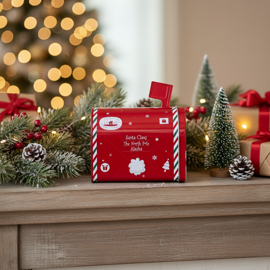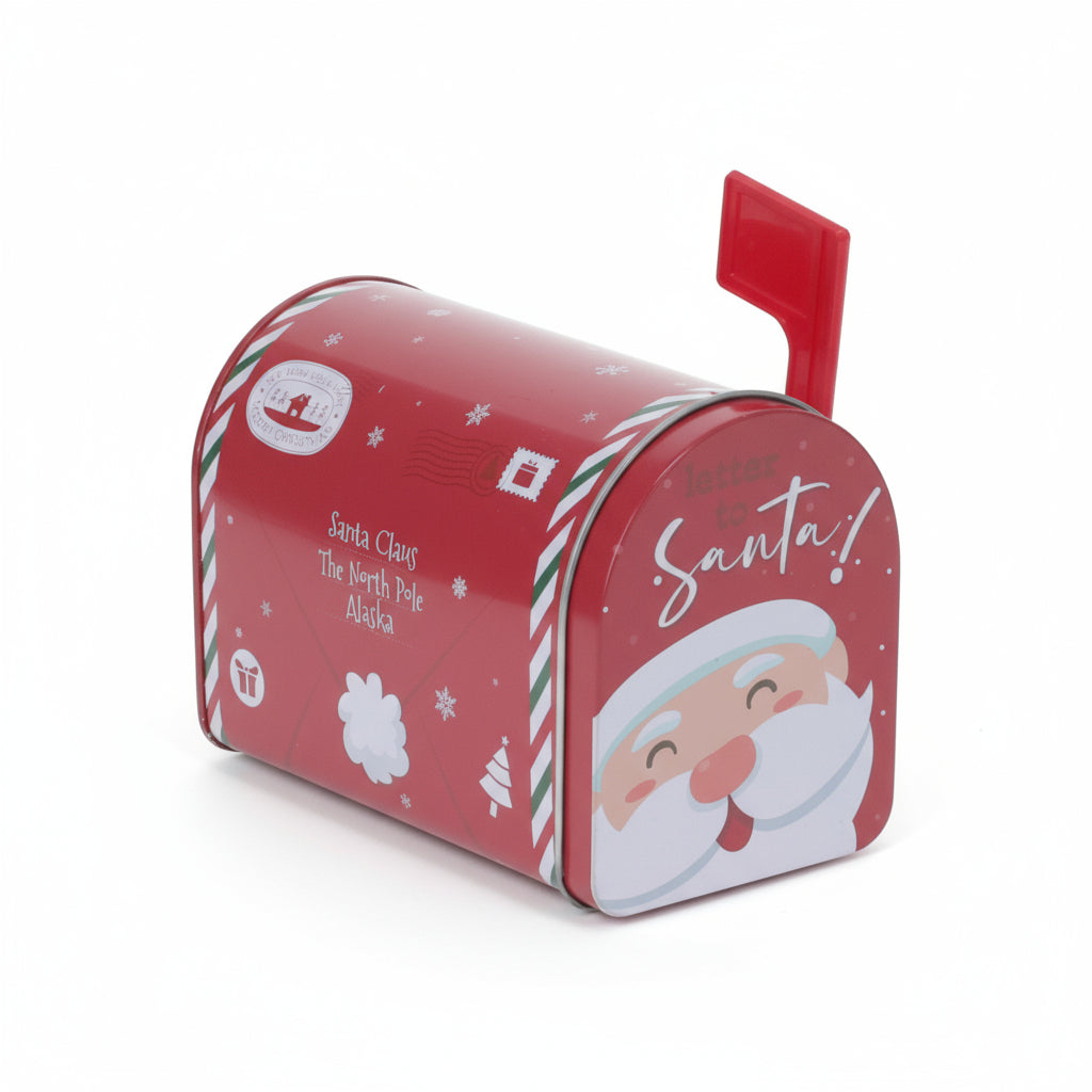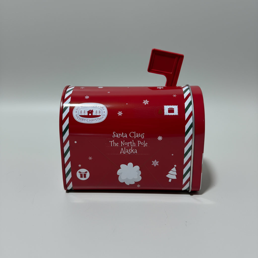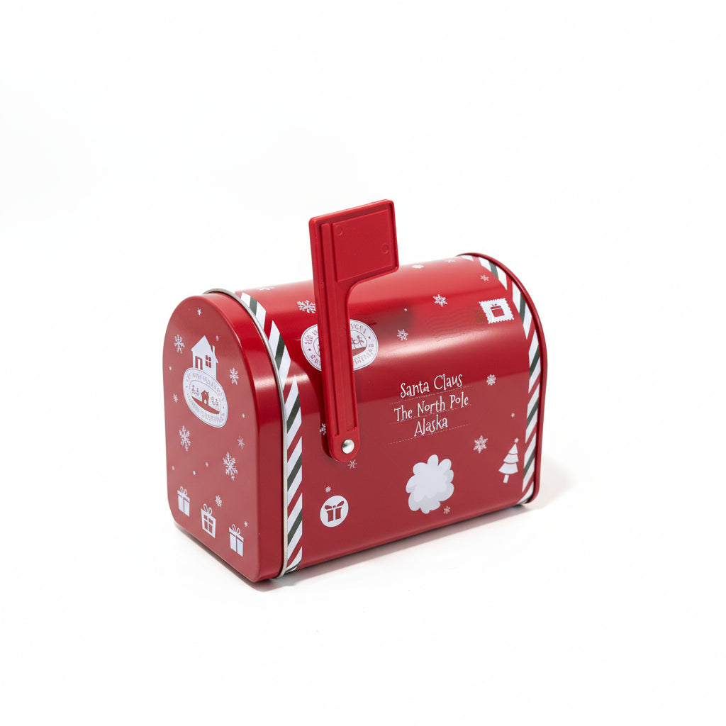 Dekorativ metallboks formet som liten postkasse med julemotiv.