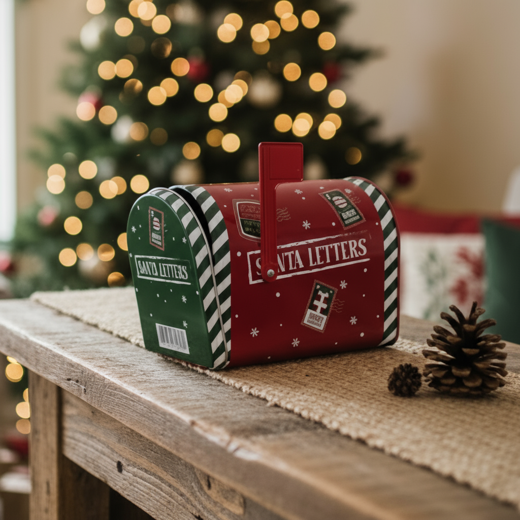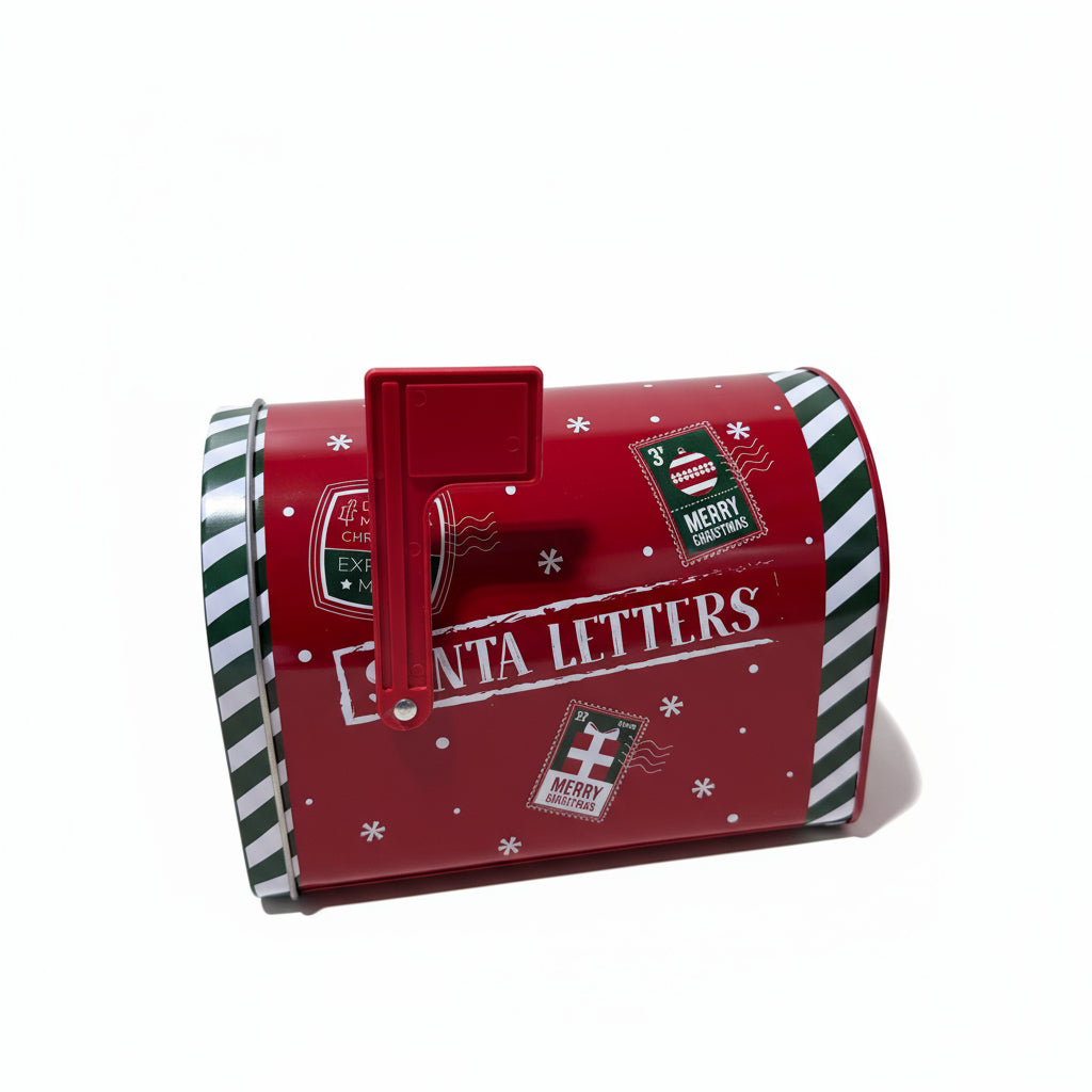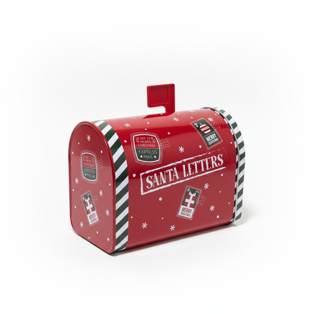 Dekorativ metallboks formet som liten postkasse med julemotiv.