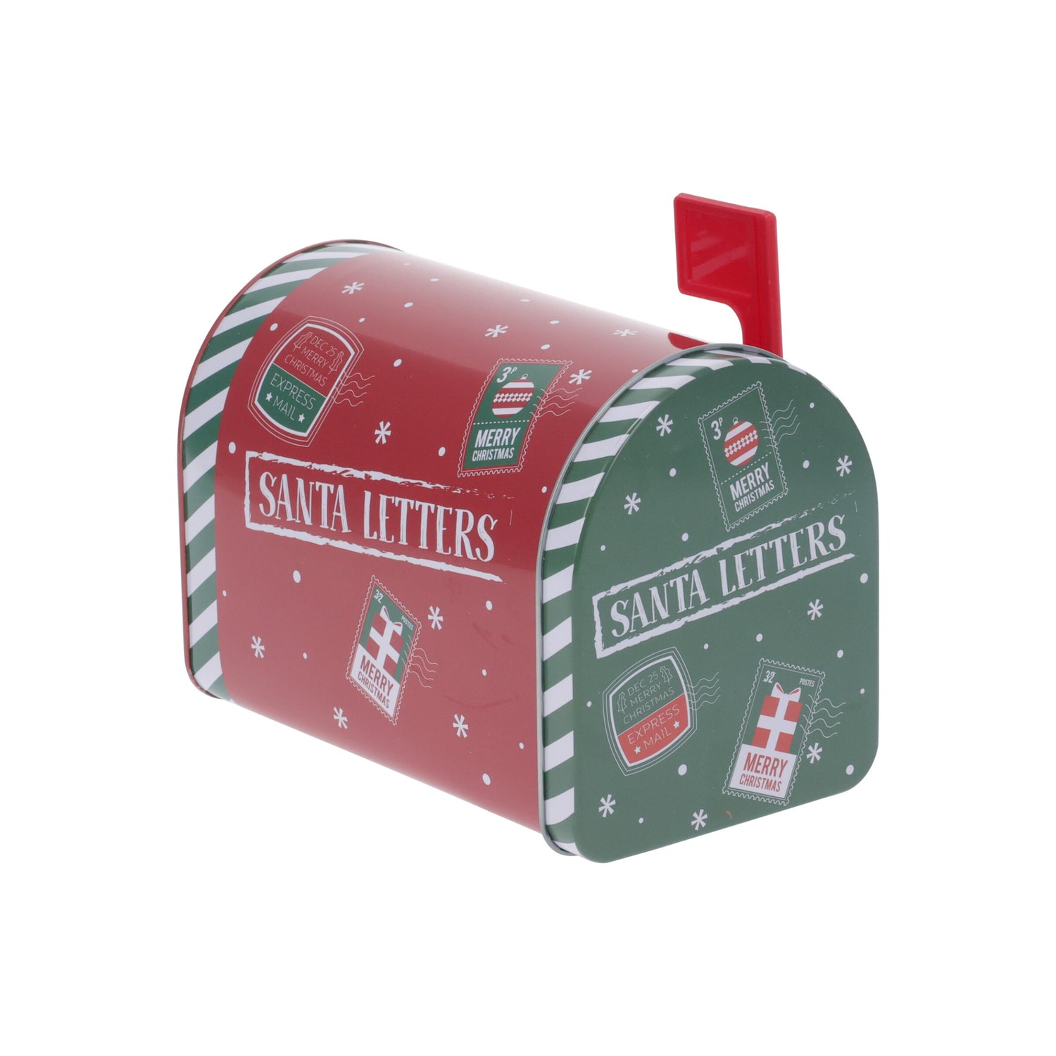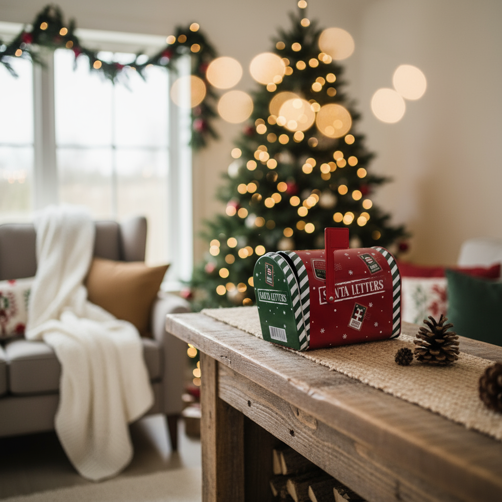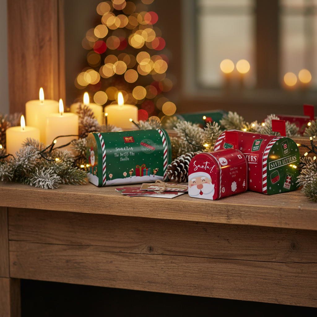 Dekorativ metallboks formet som liten postkasse med julemotiv.
