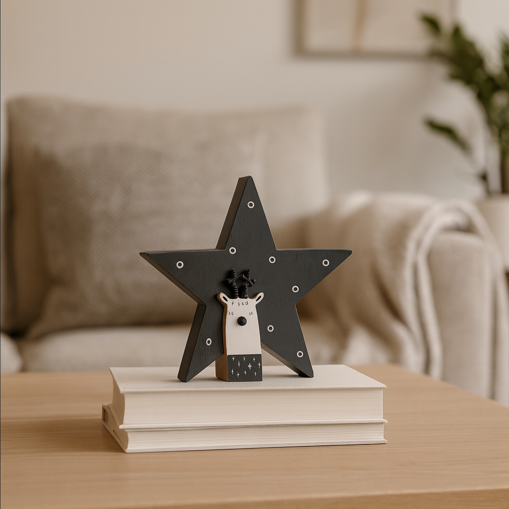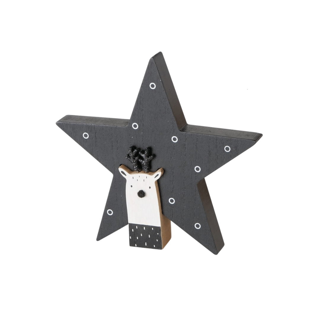 Gi barnerommet eller hjemmet et lekent preg med denne sjarmerende Rudolf-stjernen i sort tre. Figuren kombinerer den klassiske julestemningen med et moderne uttrykk, og passer like godt alene som sammen med annen julepynt. Perfekt gaveidé til de minste, eller som en koselig dekorasjon i vintermånedene.