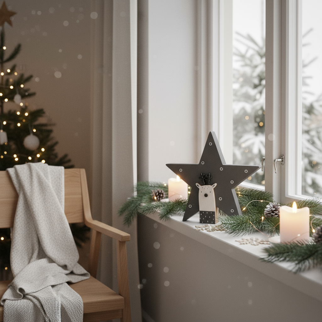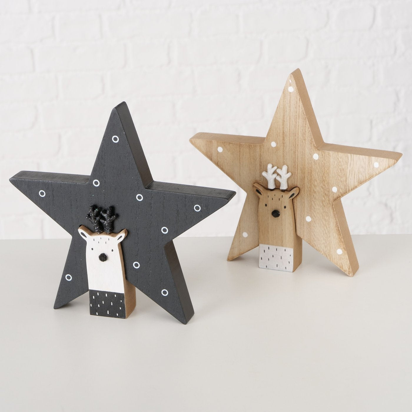 Svart og naturfarget stjernefigur med reinsdyr brukt som borddekor til jul