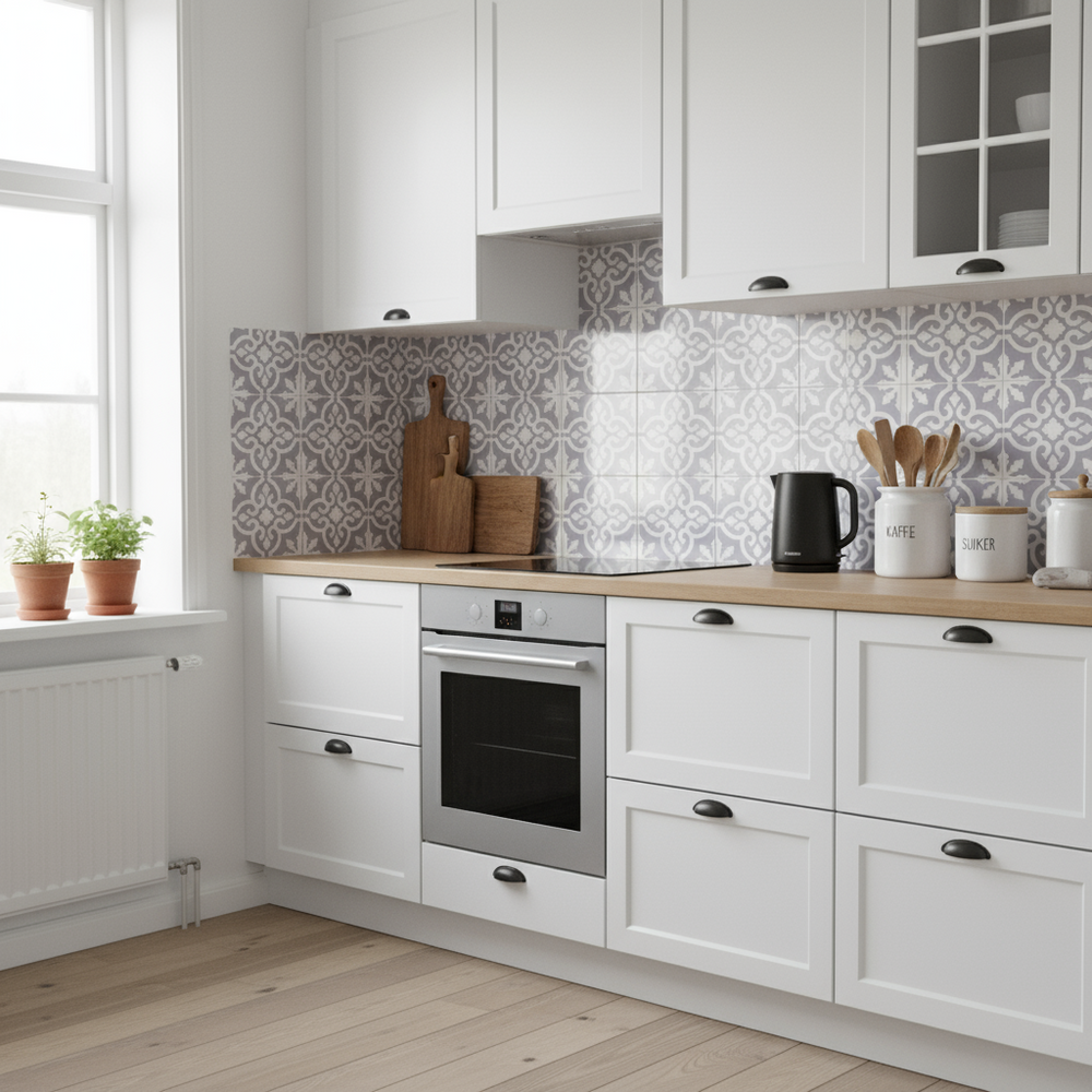 Skap et tidløst og unikt uttrykk i hjemmet med Runa selvklebende veggfliser. Med sitt klassiske marokkansk-inspirerte mønster i dempet grått og hvitt gir flisene et elegant og dekorativt preg – perfekt for deg som ønsker å kombinere tradisjonell stil med moderne løsninger.