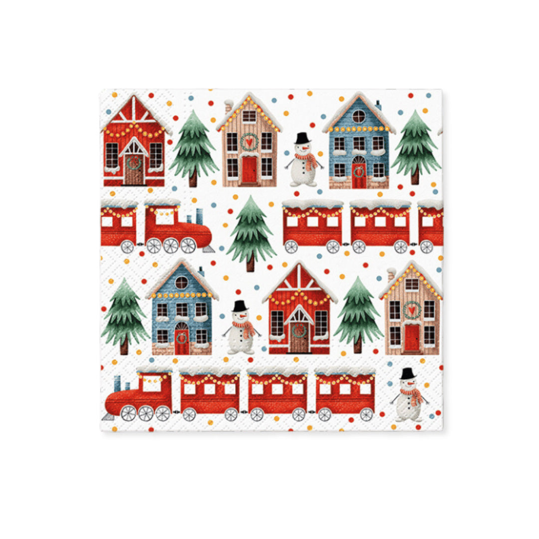 Serviett med julemotiv av tog, snømenn og hus ligger på tallerken i julemiljø.
