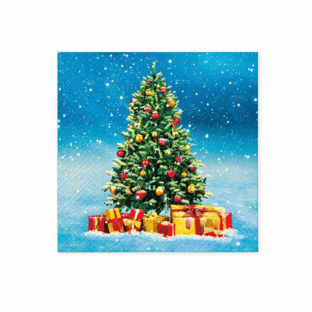 Nostalgiske servietter med juletre og pakker. Disse flotte serviettene er perfekte til å pynte opp spisebordet i juletiden. Serviettene er 3-lagspapirservietter og kommer i pakke med 20 stk.