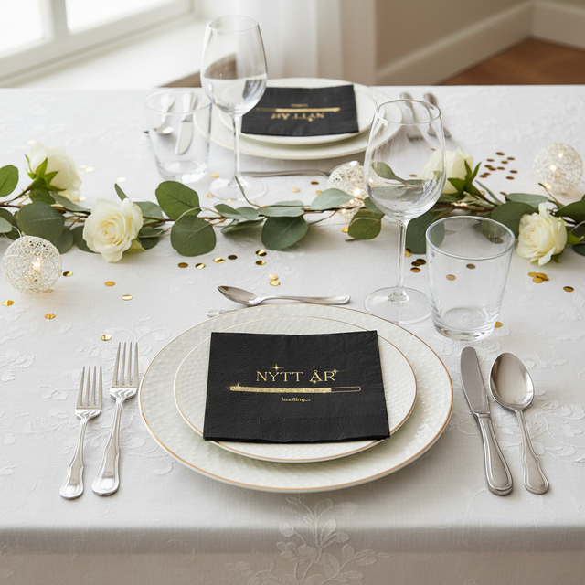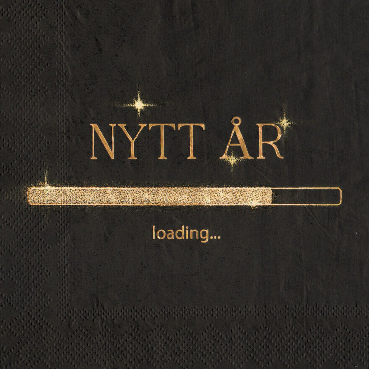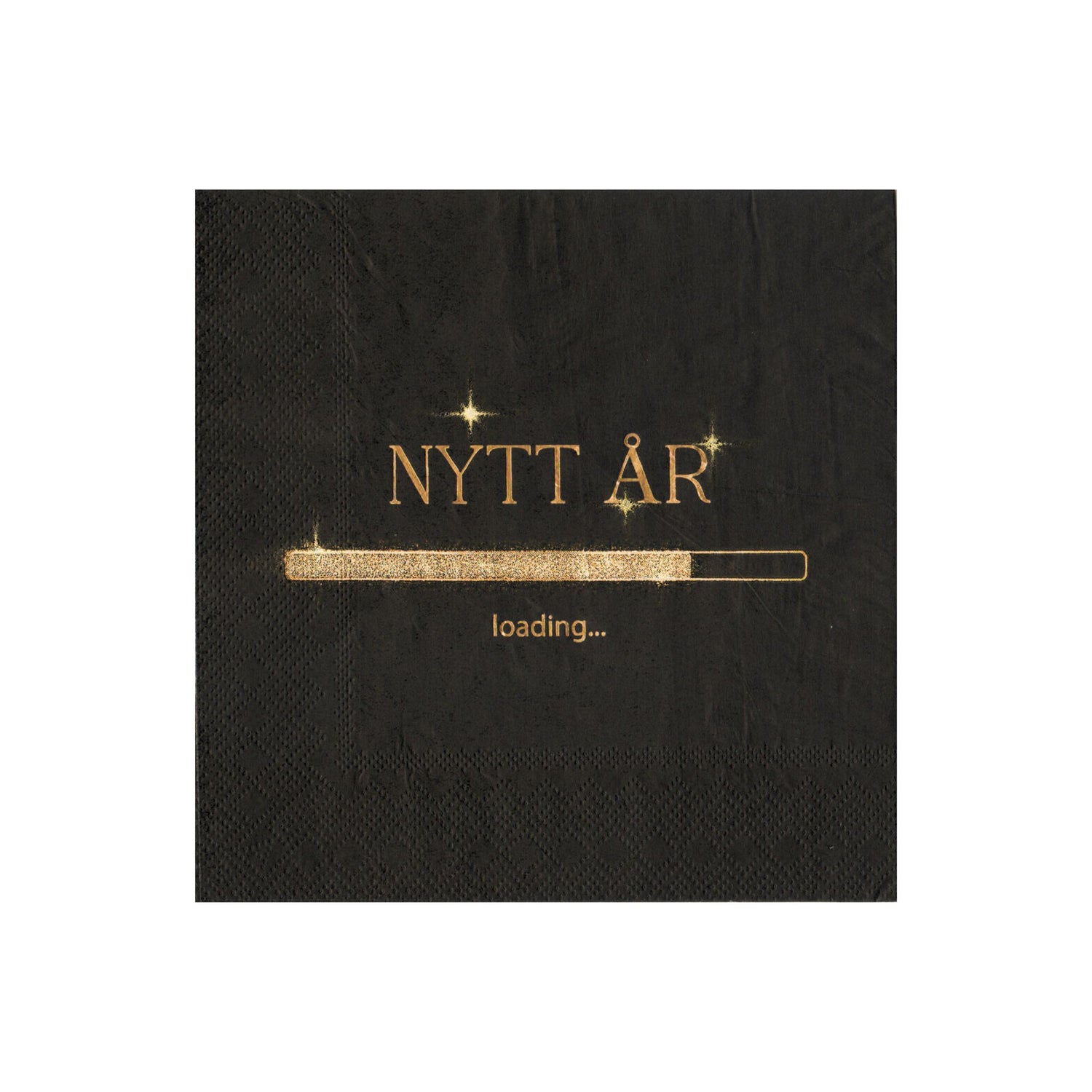 Denne stilige nyttårsservietten i sort med glitrende gulltekst er det perfekte valget for å skape en festlig stemning ved årsskiftet. Med teksten "Nytt år... loading" gir den et morsomt og moderne preg på borddekkingen.